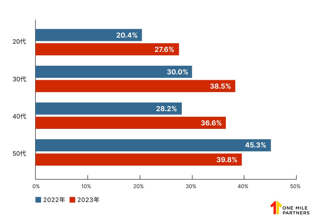 2023年の積立投資実施率は20代、30代、40代でそれぞれ対前年比で上昇