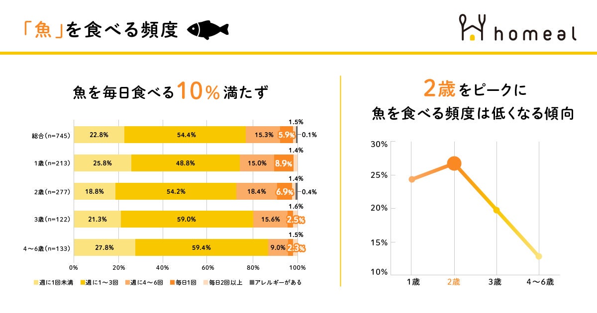 “幼児食の悩みをゼロに。”を目指す冷凍幼児食ブランド「homeal(ホーミール)」を運営するhomeal株式会社は、1~6歳のお子さんを持つ親御さんを対象に「子どもが『魚』と『肉』を食べる頻度」について調査いたしました。