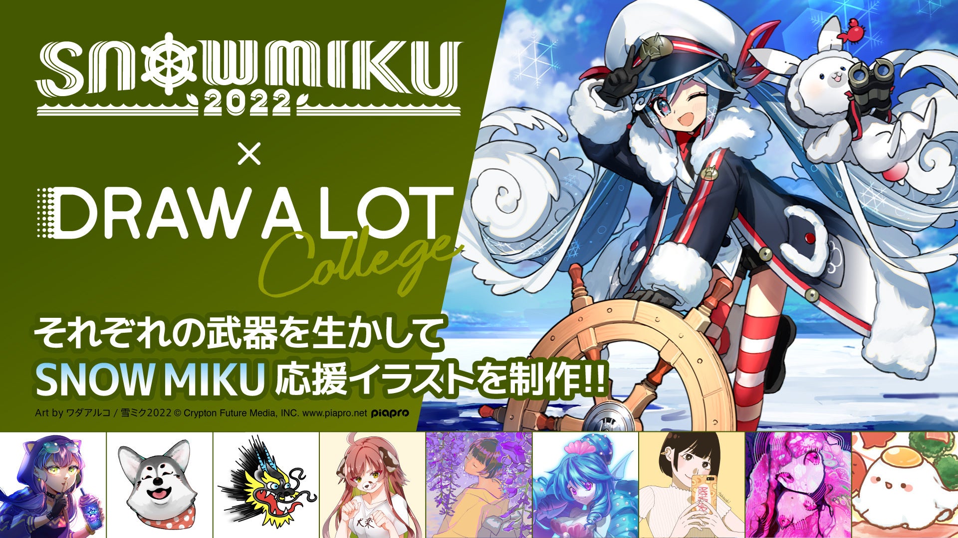 『クリエイターを「憧れ」から「なりたい」職業にし、クリエイティブ市場を持続的に発展させる』を、ビジョンに掲げるDRAW A LOTコンソーシアム(総合プロデューサー:青山薫 )は、駆け出しのクリエイターが、クリエイティブの仕事だけでメシを食えるようになる「きっかけ」を渡すプログラム「DRAW A LOT College」にて、「雪ミク(初音ミク)」が北海道を応援するフェスティバル「SNOW MIKU 2022」とのコラボレーション企画を実施いたします。