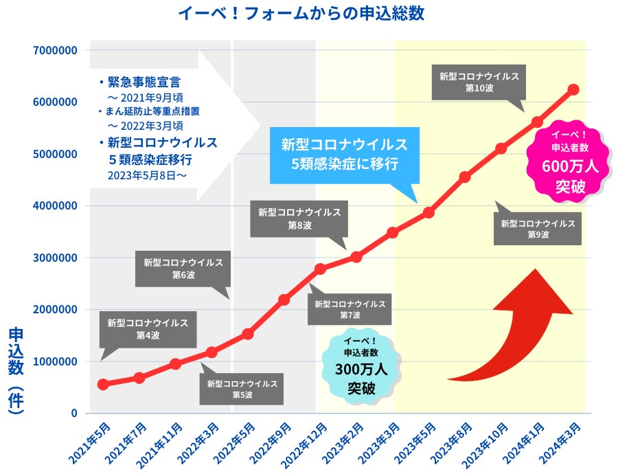 株式会社フラッグシステム(本社:福岡県福岡市、代表取締役社長:幡司恭平 以下、フラッグシステム)は、同社が提供するセミナー・イベント管理ツール「イーベ!®」のフォーム利用者が2024年3月18日時点で600万人を突破しましたことをお知らせいたします。2023年2月末に300万人を突破し、およそ1年で累計ご利用者数が倍増いたしました。