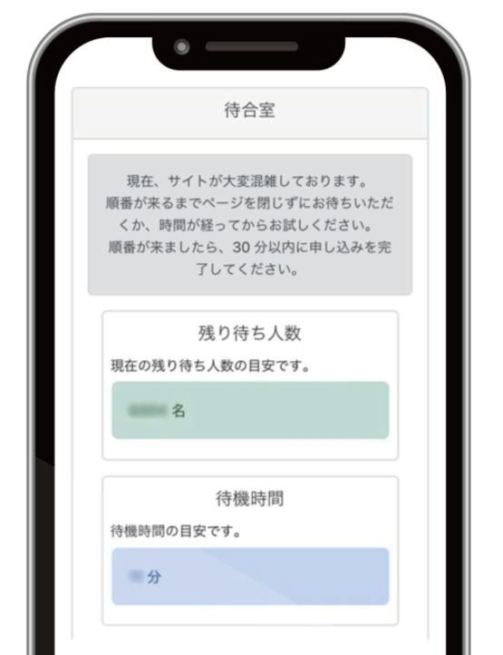 アクセス集中によるサーバーダウンを防ぐため、ページへアクセスした方にWeb上の「仮想待合室」で待機いただき、順番に申込ページにご案内する機能です。