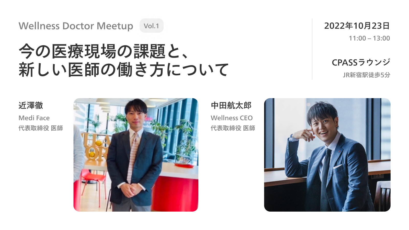 予防医療・ヘルスケア領域のスタートアップ、株式会社ウェルネス(東京都港区、代表取締役/医師:中田 航太郎)は、未来のドクター像を考えるイベント"Wellness Doctor Meetup"をスタート致します。