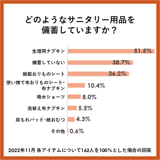 サニタリー用品のうち、女性の生理を想定した備蓄の意識は高まりつつあり、51.5%が「生理用ナプキンを備蓄している」と回答しました。