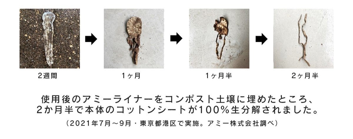 また、土に埋めれば土壌に還る性質を持つ(テスト実施済み。関東の真夏であれば2~3ヶ月程度で分解されます)ため、万一のゴミ処理も安心です。(*一般財団法人カケンテストセンター調べ)
