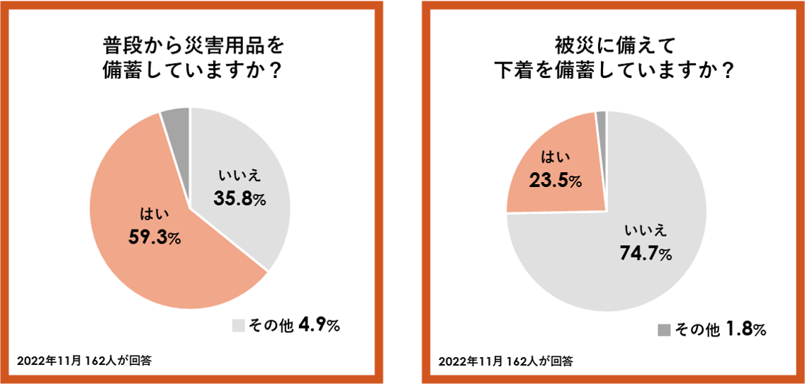 災害用品の備蓄について、「普段から備蓄している」との回答が59.3%だったのに対し、「下着を備蓄している」は23.5%に留まりました。