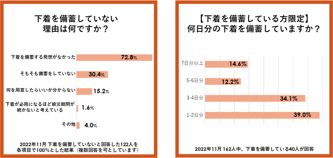 - 72.8%が「下着を備蓄する発想がなかった」と回答。「7日分以上の下着を備蓄している」は14.6%。