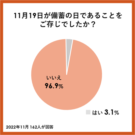 - 96.9%が「備蓄の日」を知らないと回答。備蓄に対する啓蒙活動がまだまだ必要な状況。