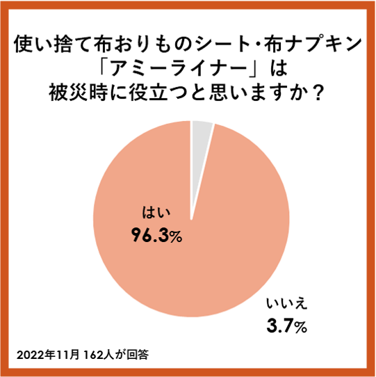 96.3%の方が「使い捨て布おりものシート・布ナプキン『アミーライナー』は被災時に役立つ」と回答しています。