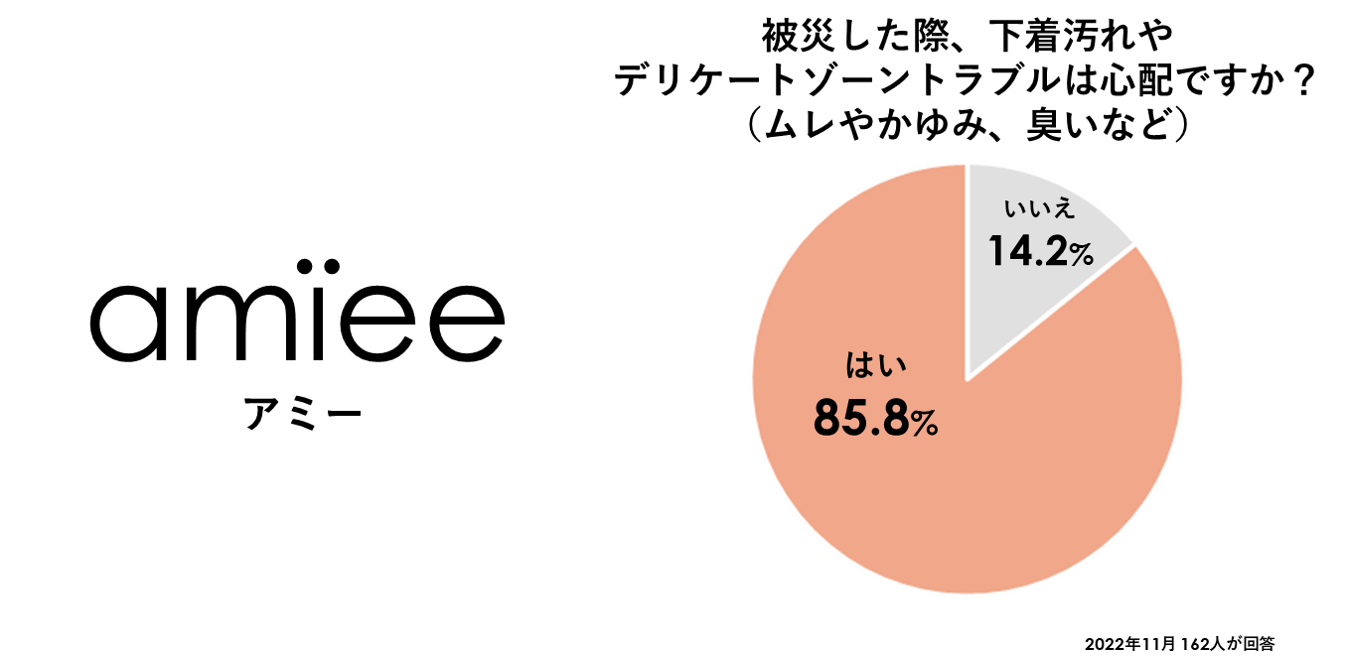 アミー社が実施したアンケート調査によると、85.8%もの人が「被災時の下着汚れやデリケートゾーントラブル(ムレやかゆみ、臭いなど)が心配」と回答。「下着やサニタリー用品の備蓄の必要性に気づいていなかった」というコメントも寄せられ、アンケートに回答することで備蓄への意識が高まったというお声も寄せられました。