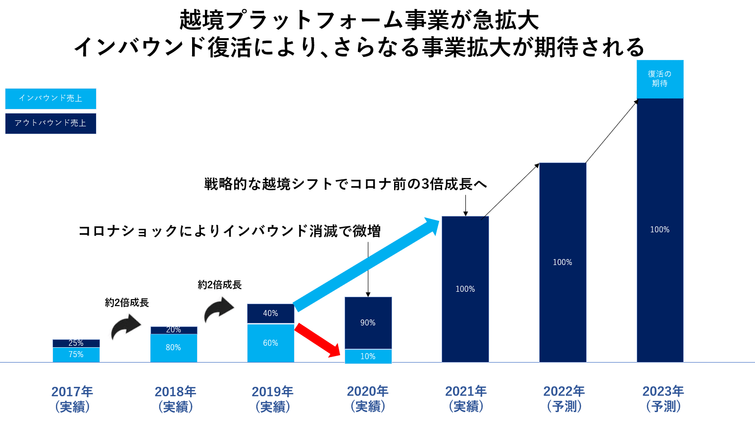 現在は、「国境の先に、新常識を。」をコンセプトに、グローバルブランド企業の商品開発、生産需要の精緻化、調査・広告、流通販売、CRMなどのバリューチェーンを支える越境ビジネスプラットフォームを提供しています。今後は、対象国を中国以外の国に拡大して事業を展開してまいります。