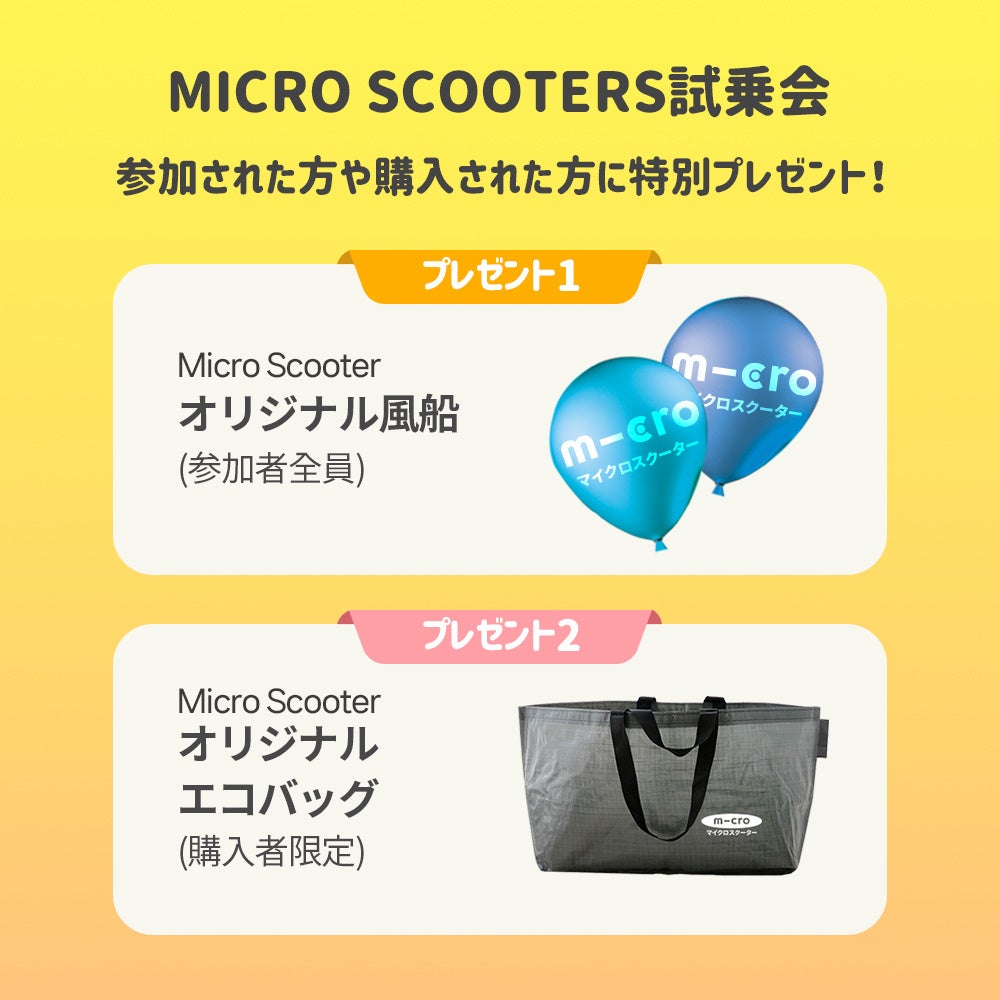 この度、マイクロスクーターでは1人でも多くのお客様にご体験して頂けるために、【NATIONAL AZABU】にて試乗会を開催します。 試乗された方にはお子様の喜ぶマイクロ風船をプレゼント、キックボードを購入された方にはキックボードの持ち運びに便利なエコバックをプレゼントします。