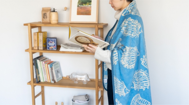 ダスティブルー×ベージュの、あたたかみのあるニュアンスカラーがおうち時間を素敵に演出してくれます。毛足がふわふわで足元まですっぽり覆ってくれる大判タイプ。ハリネズミ三兄弟の刺繍入りのタグ付きだから、壁掛けもできて収納場所にも困りません。