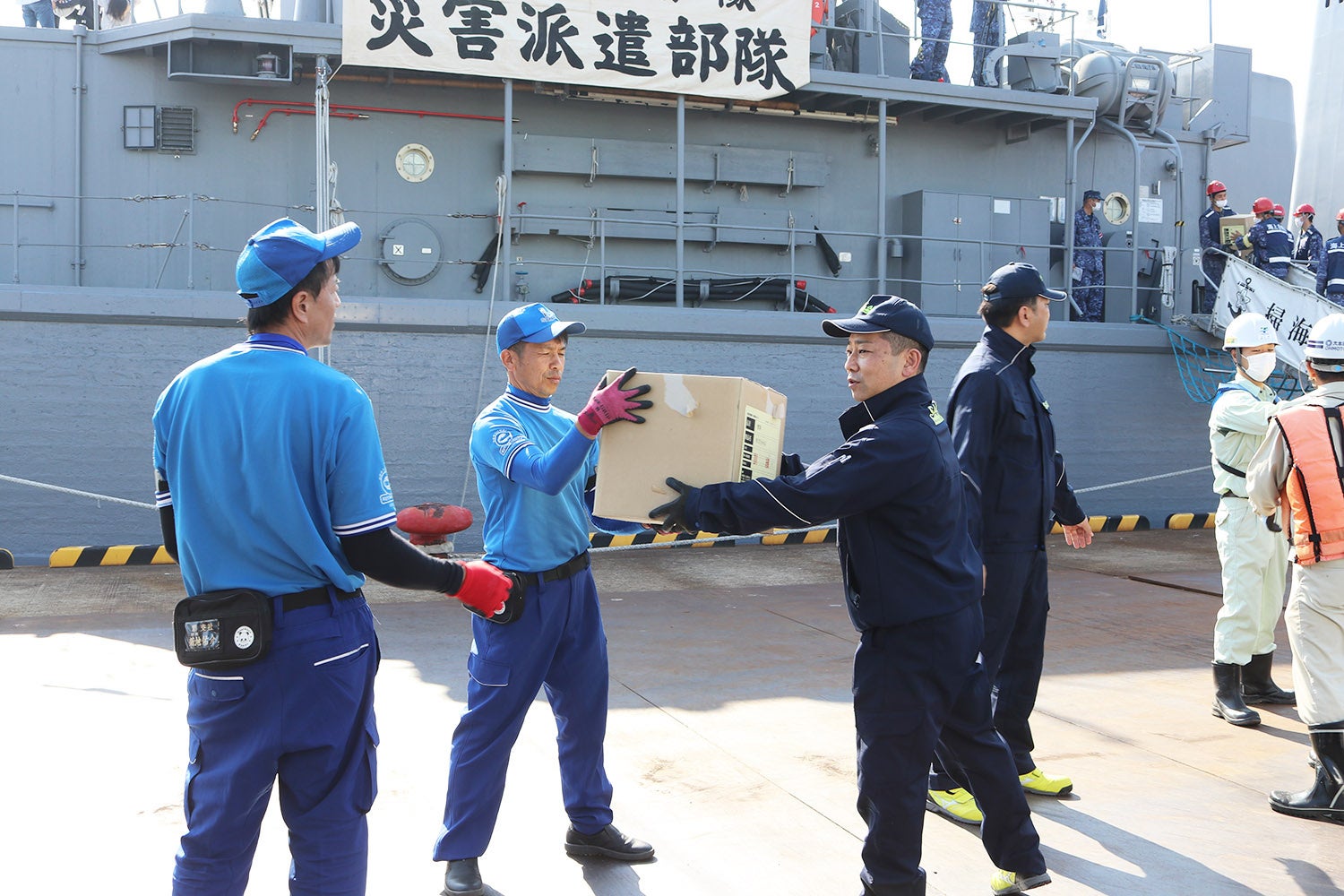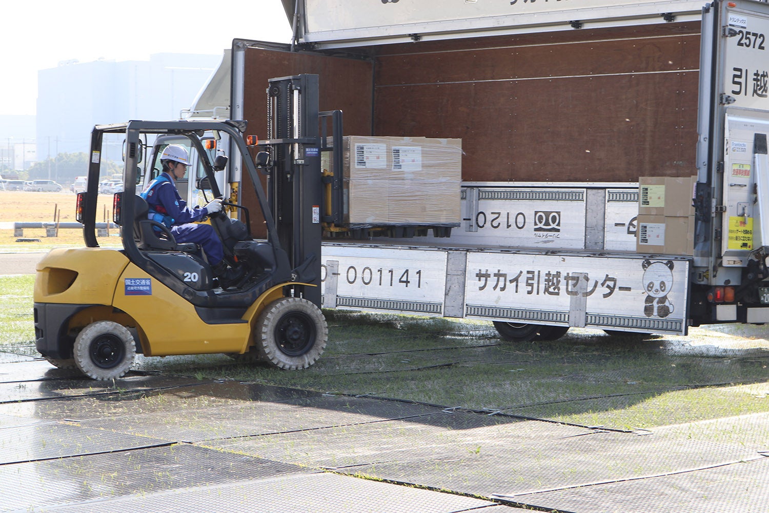 サカイ引越センターは、引越トラックを活用し、耐震強化岸壁に着岸した海上自衛隊「つのしま」から緊急支援物資をトラックに積込、防災拠点内の荷捌地に運搬しました。また、エアーテント内の決められた位置に緊急支援物資の一部を積み下ろし、サカイ引越センターのトラック3台は、北護岸、波除堤護岸へ移動し、港湾業務艇「いずみⅡ」および会場自衛隊「1034」へ緊急支援物資を積み込みました。