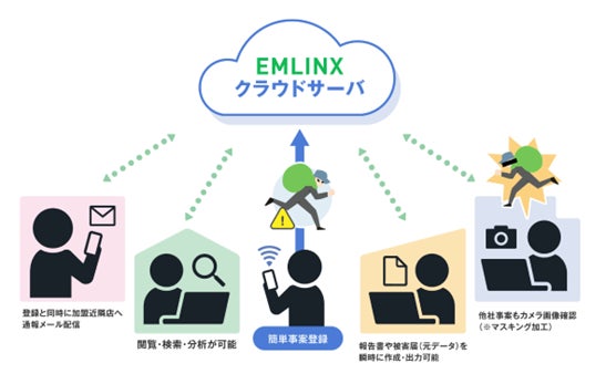「EMLINX(エムリンクス)」は、小売店舗で発生する盗難・万引被害を企業や業界の垣根を超えて情報共有する、クラウド型の防犯サービスです。今回の展示会では、Eagle Eye×VAAKによる映像解析技術を活用することで得られる被災及び被害情報を、関係機関や近隣住民と即時共有できる手段として、「EMLINX(エムリンクス)」を利用し、自然災害や人為災害の被害を最小限に抑える方法を提案する予定です。