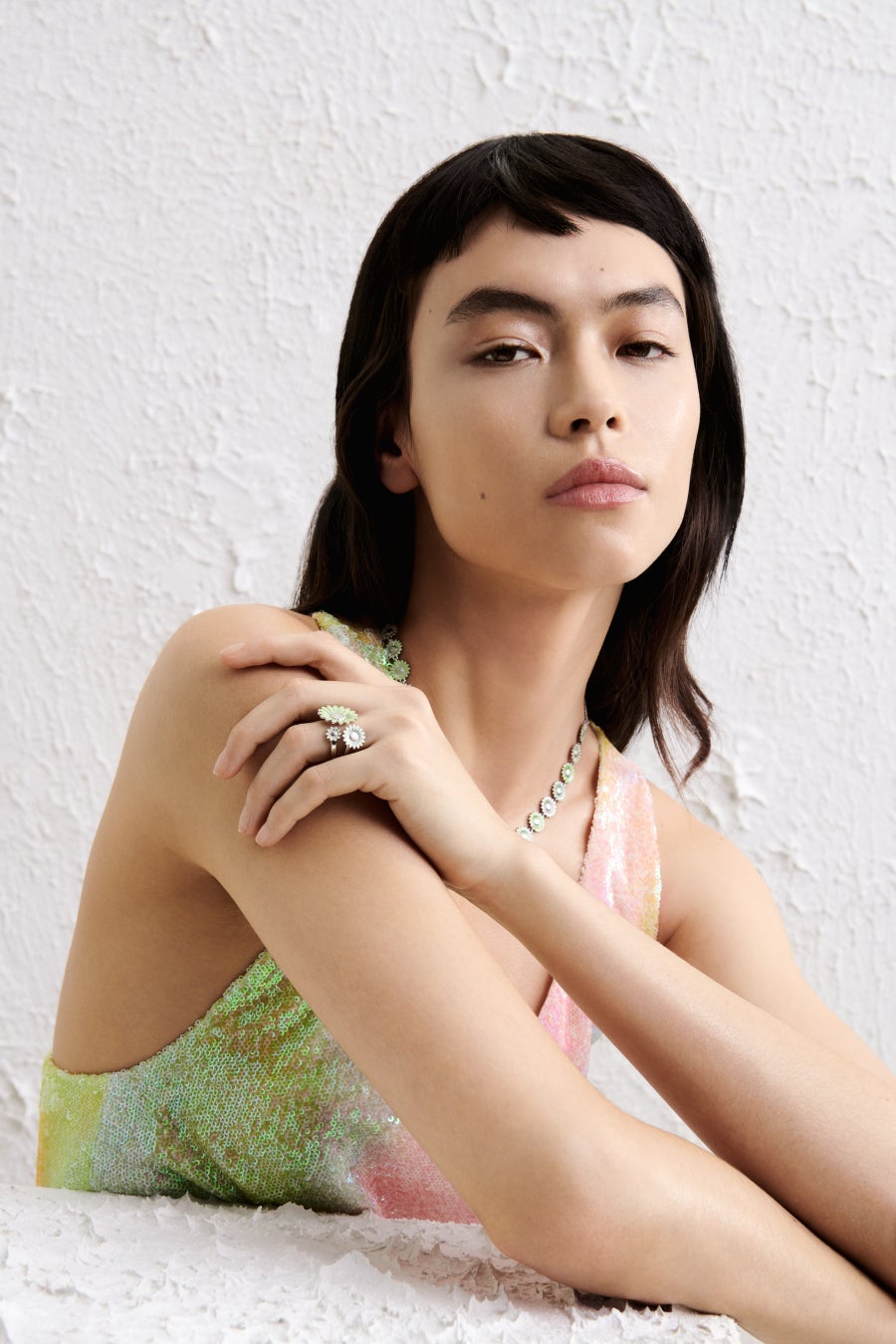 花びら一つ一つを手作業で加工したビビッドグリーンは、自然をモチーフにしたコレクションの本質と、新しいデザインの両方を表しています。