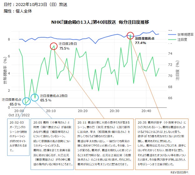 ご家庭に人体認識技術を搭載した機器を設置し、テレビスクリーンの「視られている量」を測るREVISIO株式会社(2022/10/1にTVISION INSIGHTSから社名を変更、所在地 :東京都千代田区、代表取締役社長 郡谷 康士、以下REVISIO)は、2022年1月にスタートした、三谷幸喜さん脚本・小栗旬さん主演の『鎌倉殿の13人』を、毎放送回、視聴者がどのシーンに注目したのかを分析しています。