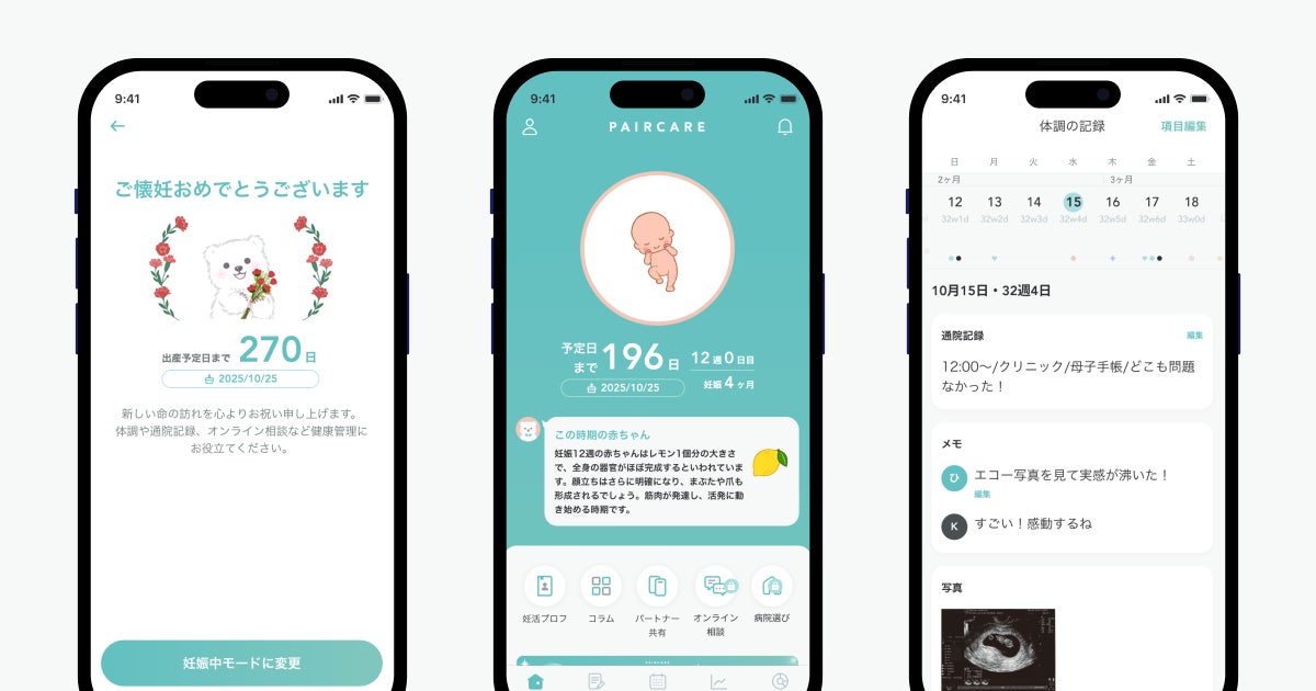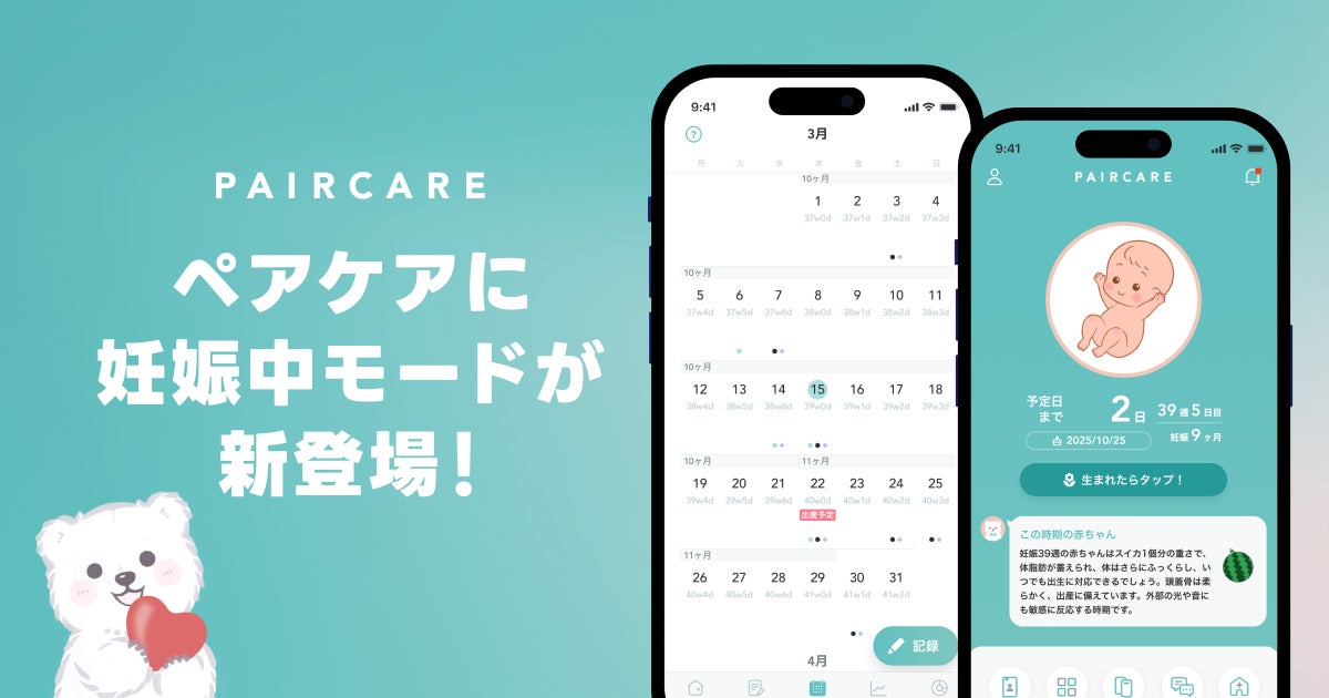 このアップデートによって、「ペアケア」は生理管理から妊活、妊娠、出産まで一貫して対応できるアプリとなり、妊娠中も継続して利用できるサービスとなります。また、パートナーとの情報共有も一貫してスムーズに行え、他のアプリを使う必要がなくなります。