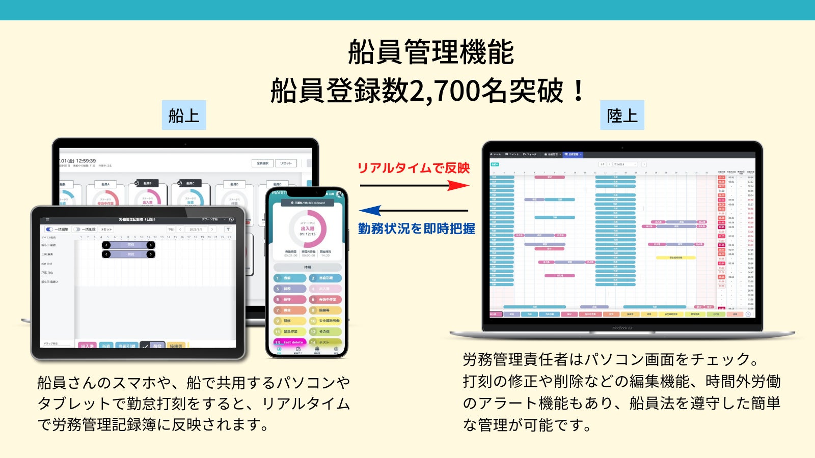 さらに今年は動静管理機能(6月頃)、受発注機能(7月頃)、給与連携機能(今夏)の追加リリースを予定しており、今後も海事産業における課題解決に特化したサービスの拡充を加速させていきます。