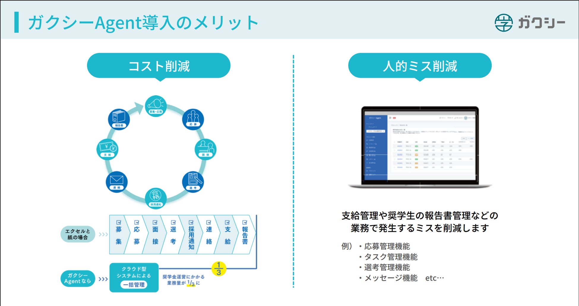 「ガクシーAgent」(https://agent.gaxi.jp/)は、応募者の募集から選考・学生管理に至るまでの業務を一元化することで奨学金業務を効率的に進めることのできるクラウド型システムです。