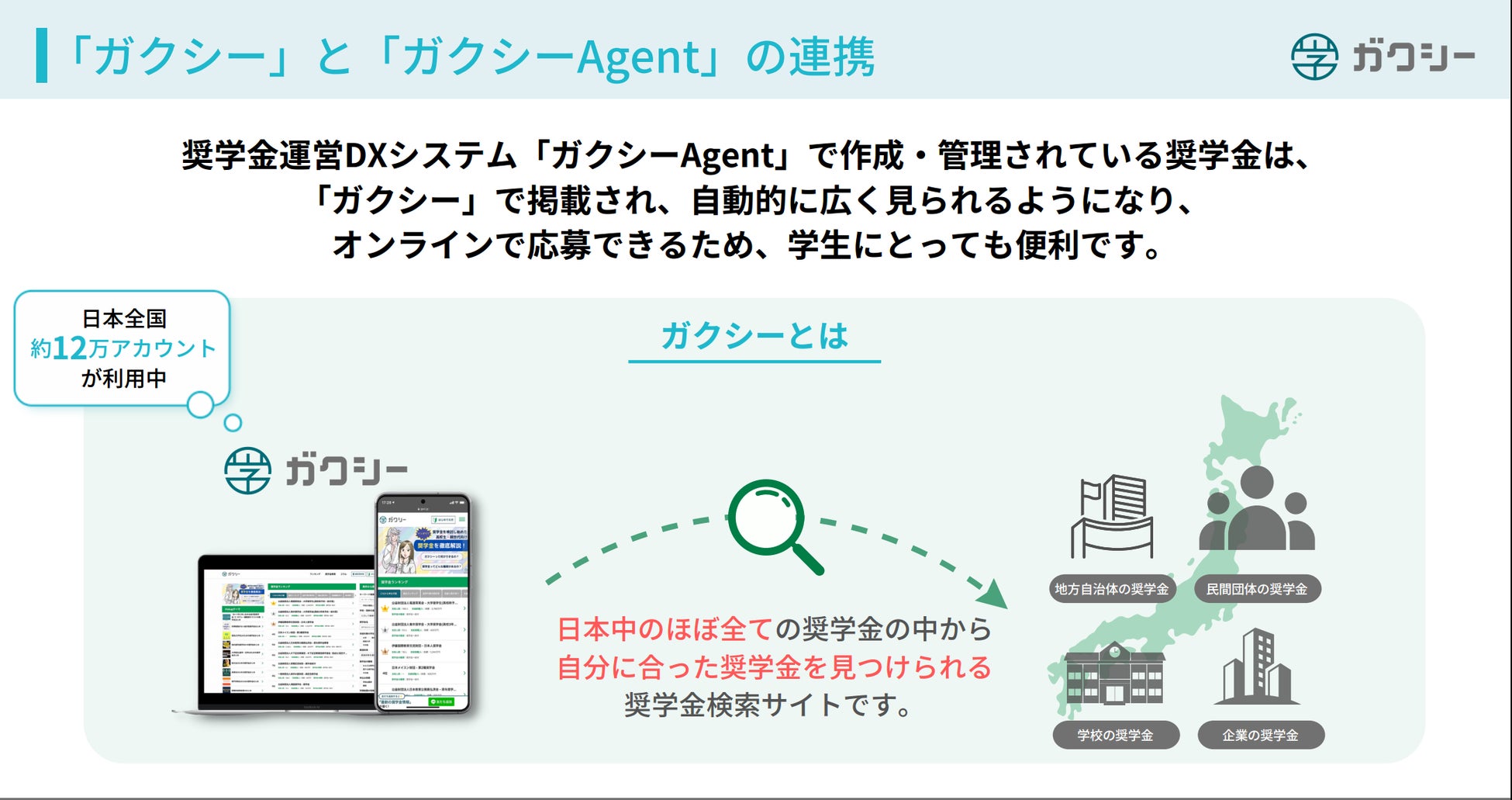 ガクシーAgentで登録した奨学金情報はガクシーに素早く反映され、学生・保護者が円滑に奨学金を見つけることができます。さらにそのままのオンラインからの応募や、書類の提出、面談、合否連絡、その後の奨学金の支給/返済管理までワンストップでオンライン化することが可能になり、ユーザーである学生・保護者と、奨学金の運営団体双方の負荷と煩雑さを減らします。