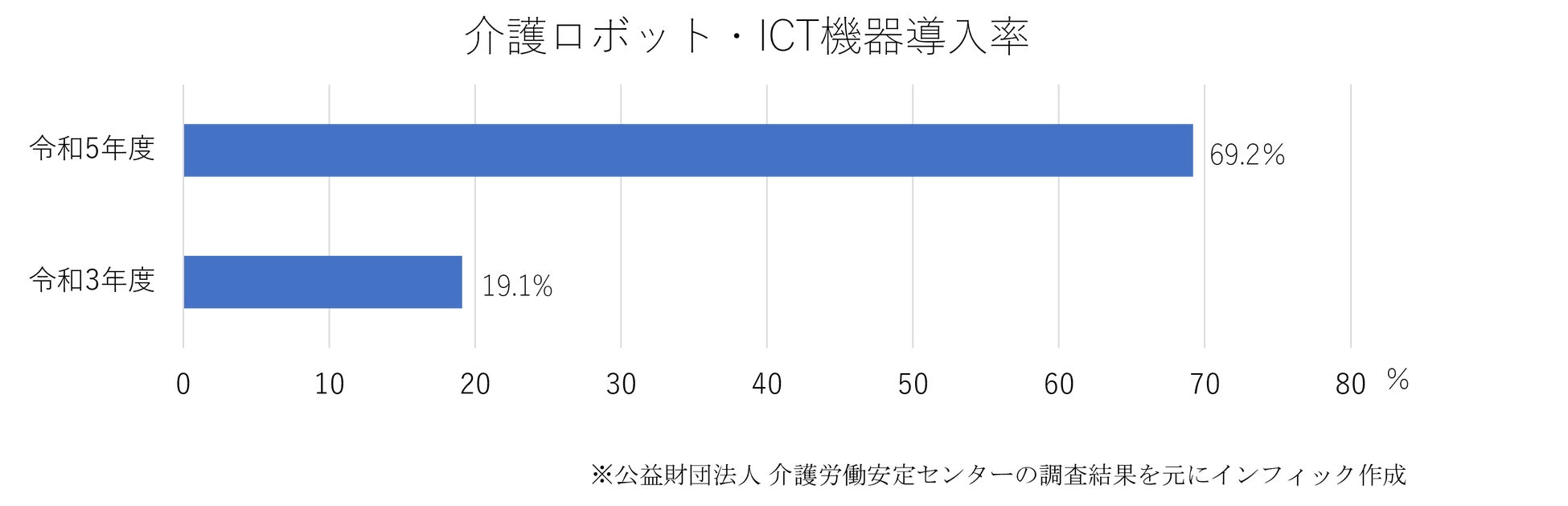 IT介護士とは、介護スキルだけではなく現場に即したIT知識を持ち合わせ、介護現場のIT化を促進できる人材です。インフィックは昨年5月に民間資格を取得できるカリキュラムを開発し、IT介護士初級の講座を開講しました。現在約400名が受講し、受講生から「パソコンやIT機器に苦手意識があったが、明日から積極的に使ってみようと思う学習内容でした」、「IT機器を現場により浸透させるためにもスタッフ全員に受けてほしい内容でした」などの声が挙がっています。下記図1、公益財団法人 介護労働安定センターの「介護労働実態調査」からも読み取れるように、自治体がIT導入補助金を給付したこともあり、介護現場に介護ロボット・ICT機器等の一定の導入は進んでいます。