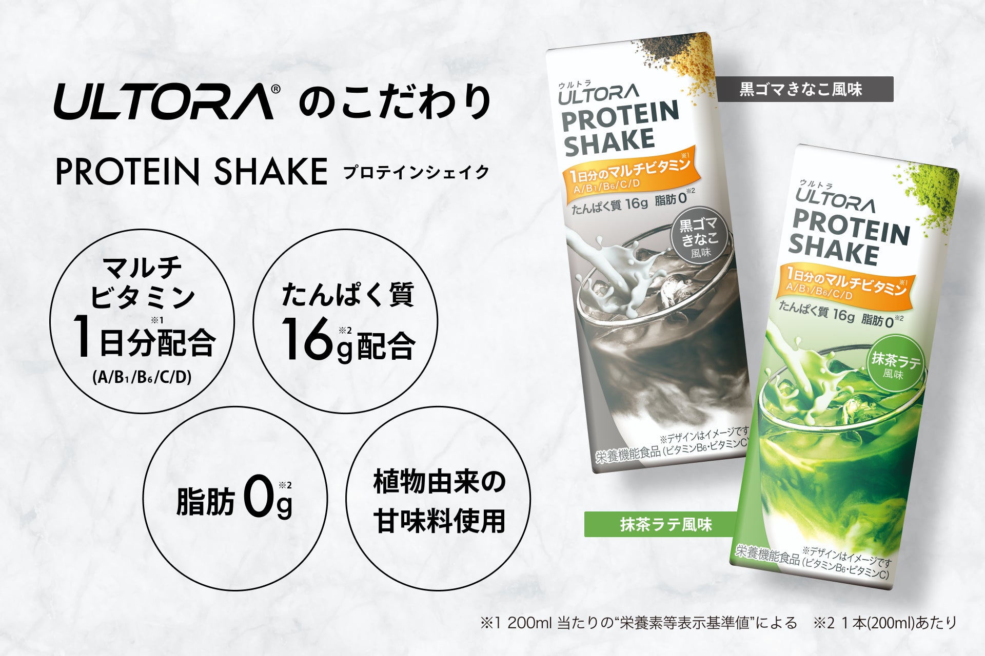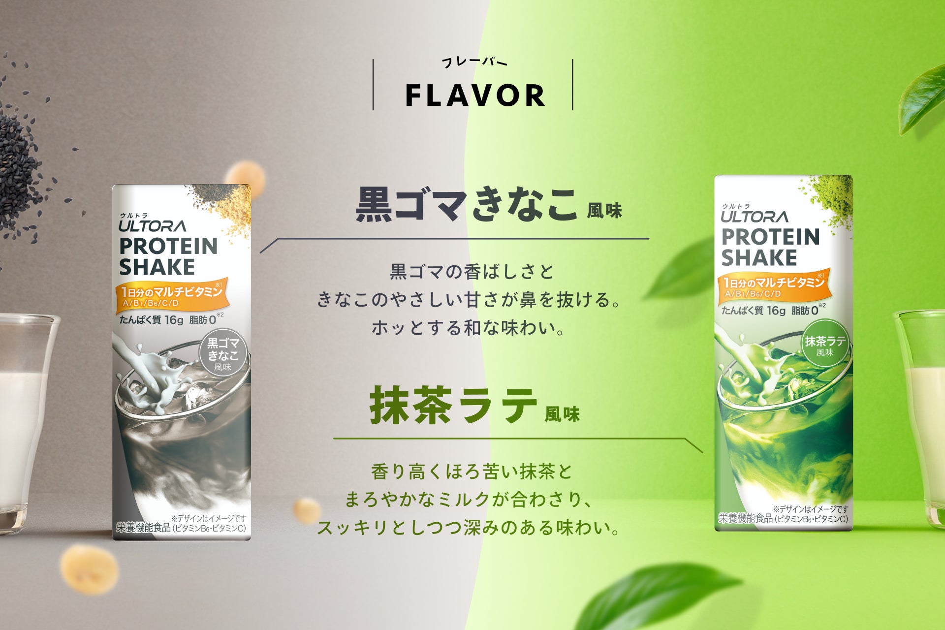 フレーバーは、ULTORAプロテインシリーズの中でも特に人気の高い「抹茶風味」と「黒ゴマきなこ風味」の2種類を採用しました。