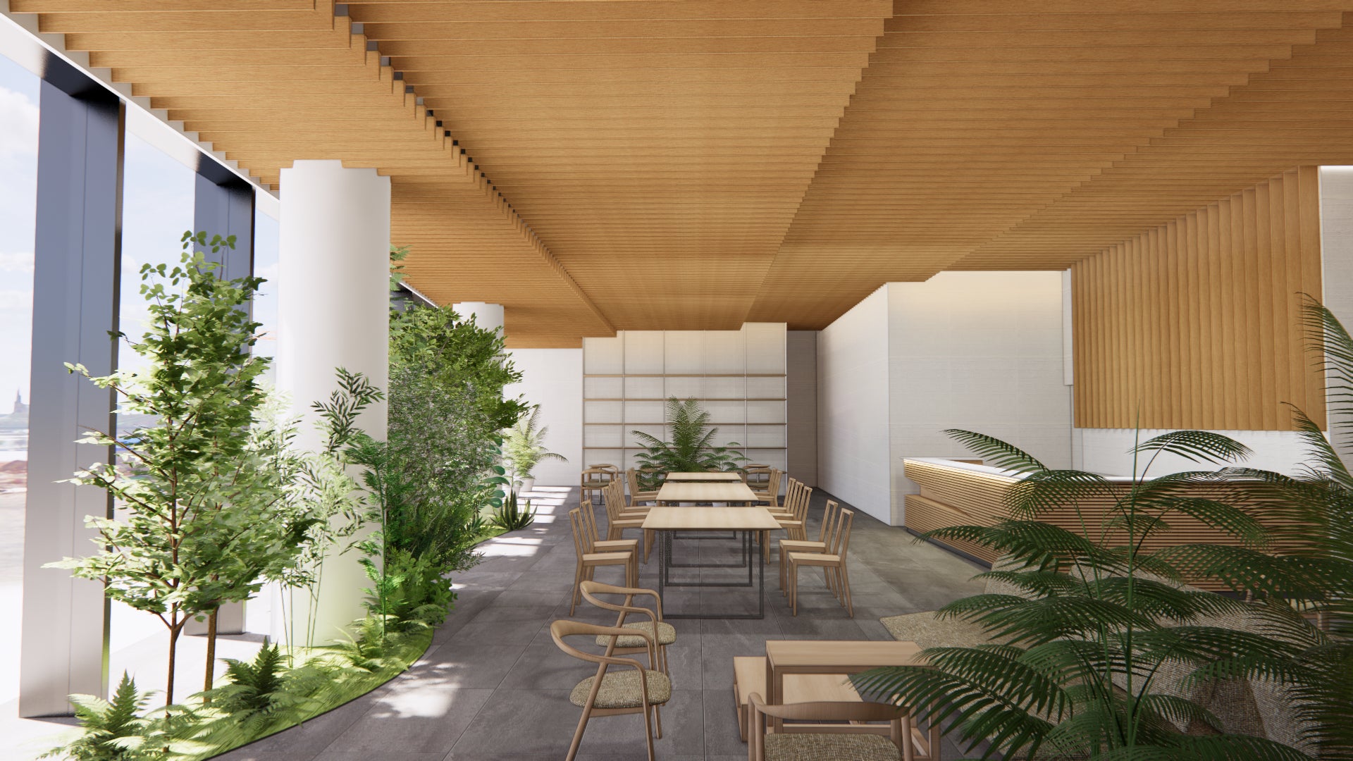 1階のロビー・カフェ・ライブラリー、2階のトレーニングジム・会議室(12月完成予定)などの付帯施設のデザインはすべて世界的建築家の隈研吾氏が担当。自然親和的な同氏のデザイン哲学が窺える緑の植物に溢れた空間となっています。