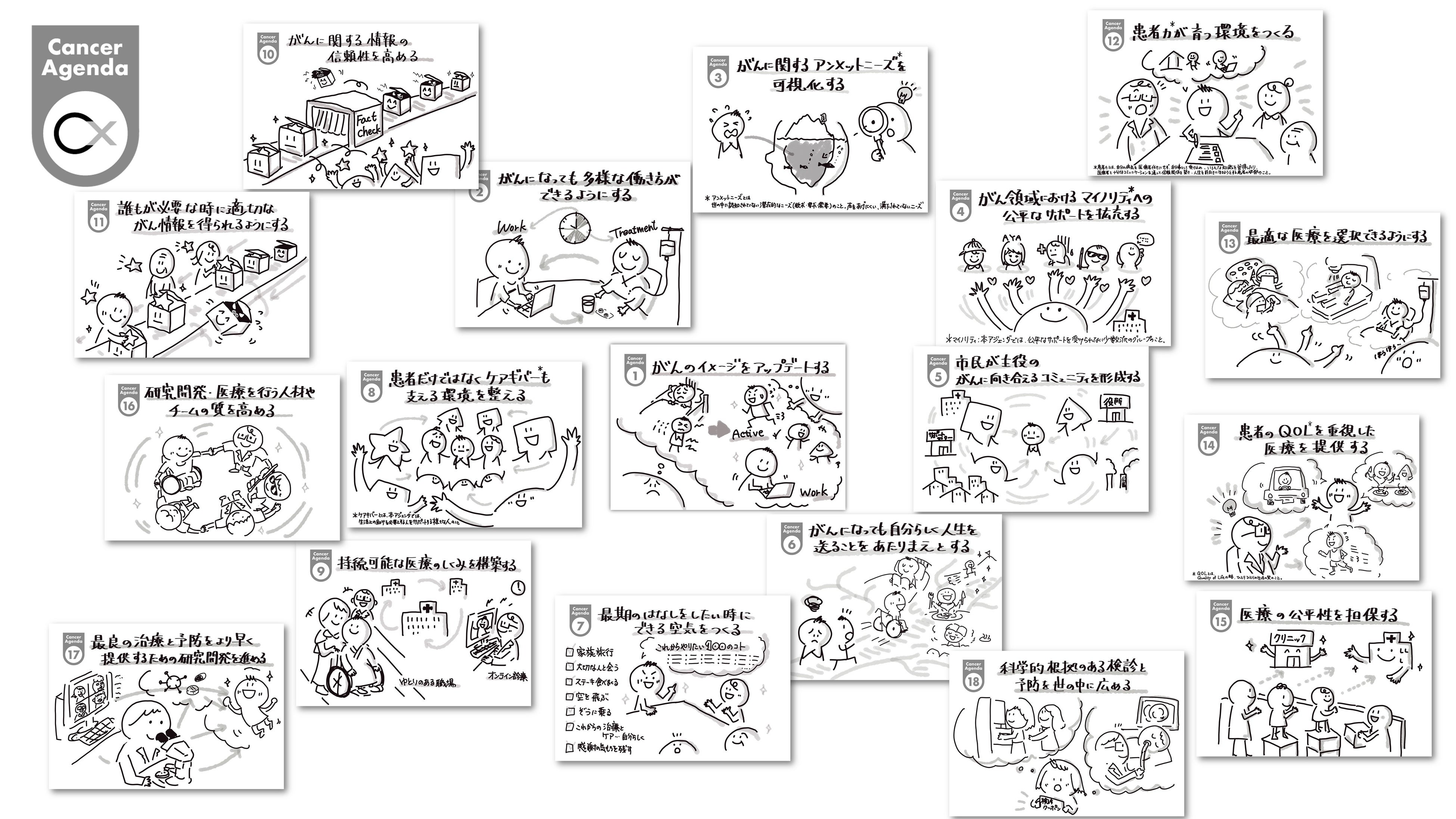 がんにまつわる社会課題を具体的に18項目にまとめました。