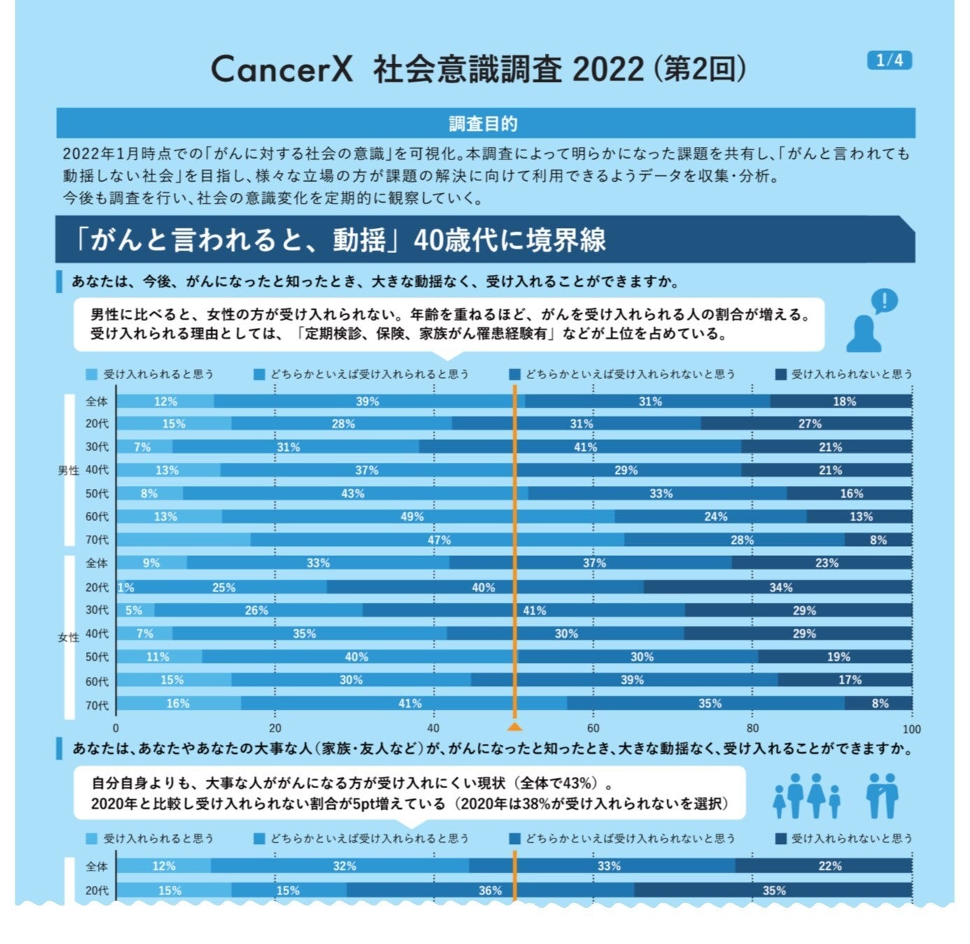 2022年1月時点での「がんに対する社会の意識」を可視化。本調査によって明らかになった課題を共有し「がんと言われても動揺しない社会」を目指し、様々な立場の方が課題の解決に向けて利用できるようデータを収集・分析しました。