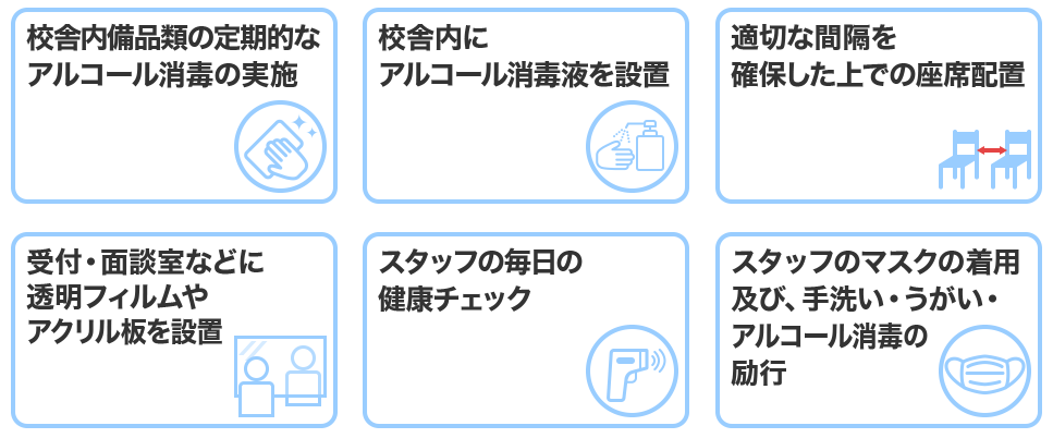 ・教室内では換気を頻繁に行います。室温の変化に対応できる服装での来校をお願いいたします。
