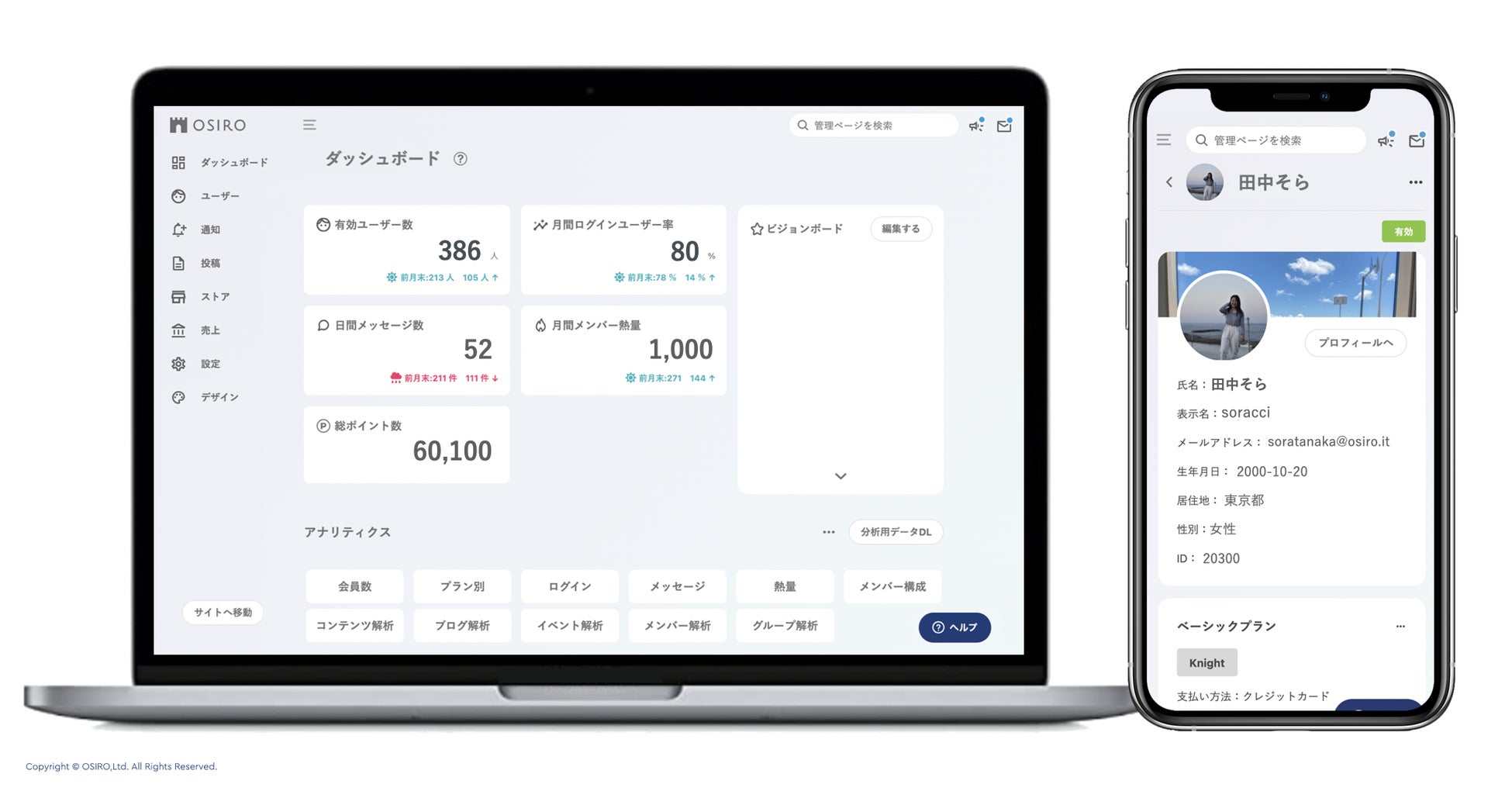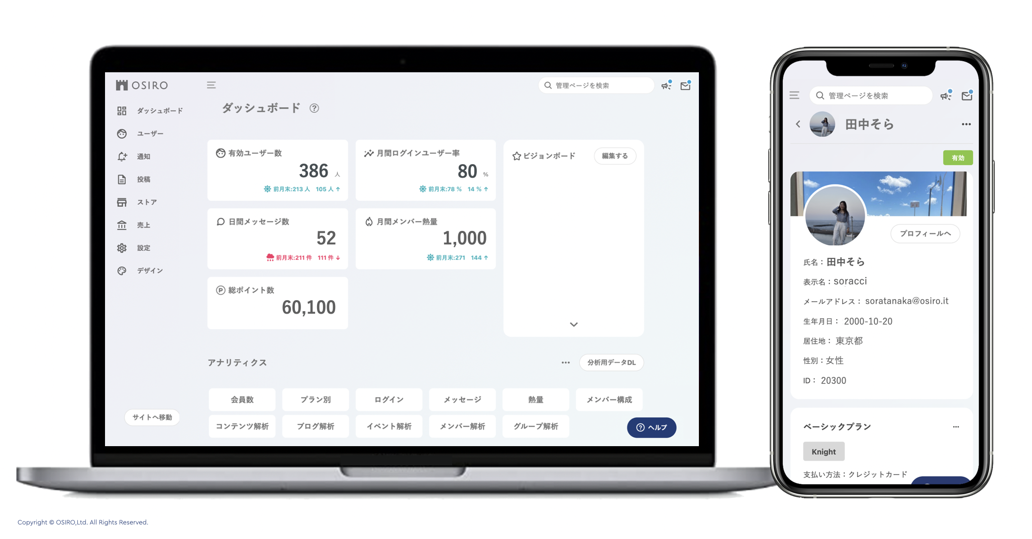 「OSIRO」は、会員・課金管理機能、豊富なコミュニケーションツールはもちろん、カートレスEC機能にいたるまで、オンラインコミュニティを運営、活性化するための全ての機能が集約されています。システムと運営に精通し