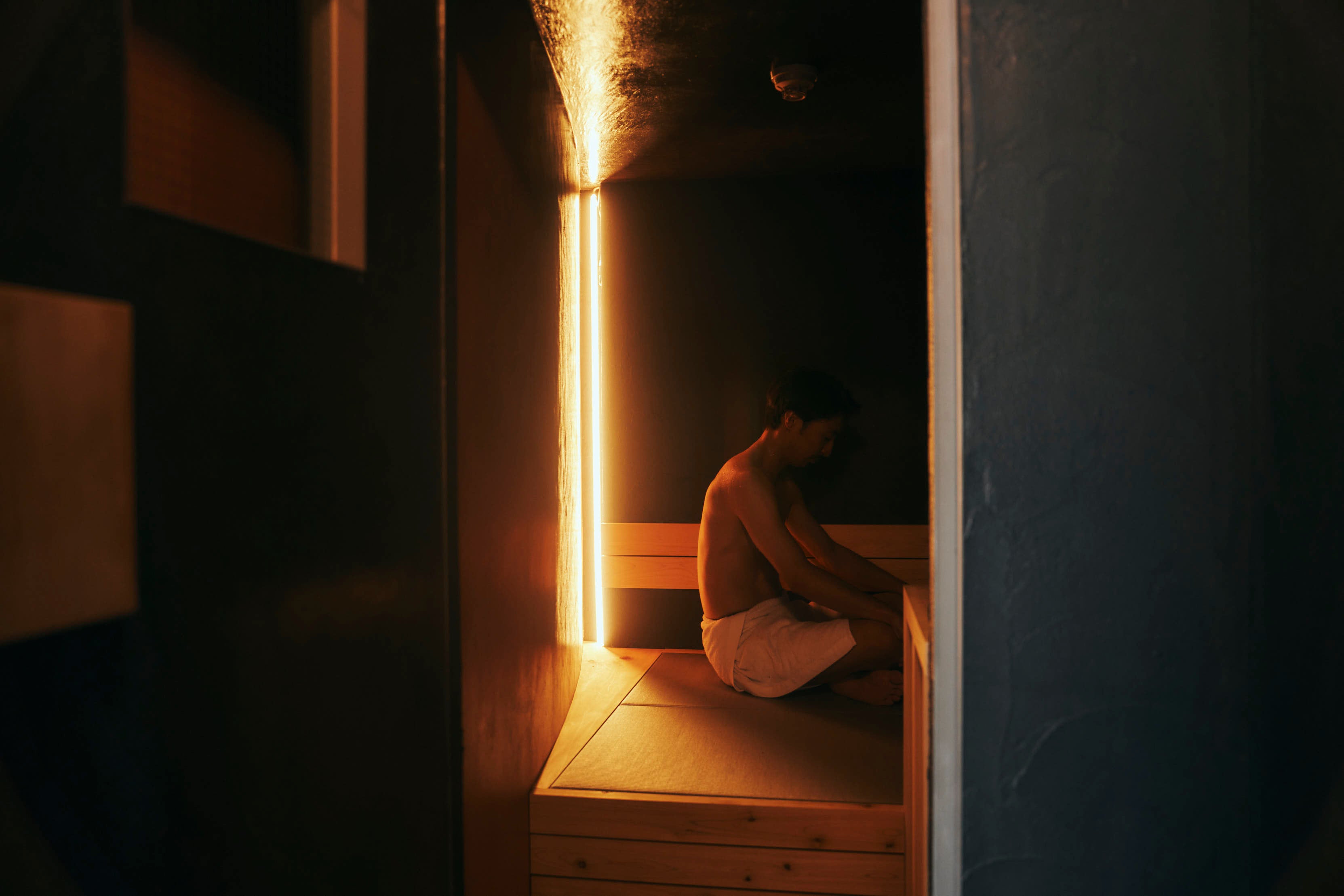 5階のホテルレジデンスフロアの一角には4名まで同時に利用可能なプライベートサウナが備わります。サウナの内装は2Fラウンジと同じく「& Supply」が監修し、その室内に流れる音楽は三軒茶屋のレコードショップでアンビエントミュージックを得意とする「Kankyo Records」が担当。当館オフィスやホテルの利用者のみでなく、街に開かれたパブリックなサウナ施設となります。