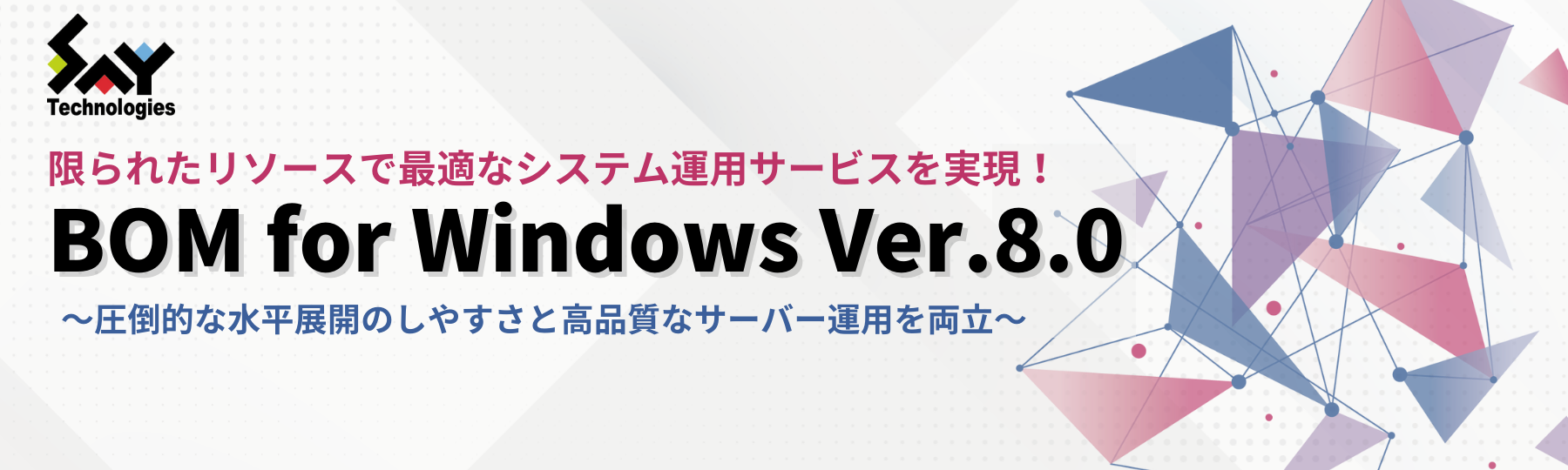 サーバーシステムの運用管理ソリューションを提供するセイ・テクノロジーズ株式会社(本社:東京都文京区、代表取締役社長:三瓶 千里)は、システム運用サービスの立ち上げを支援する自立分散型サーバー監視ソフト「BOM for Windows」の最新メジャーバージョン「BOM for Windows Ver.8.0」を7月1日から販売開始します。