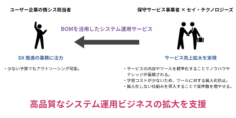 その仕組み作りにおいて、セイ・テクノロジーズが新たに提供する BOM for Windows Ver.8.0 は大きな効果を発揮します。今回リリースする Ver.8.0 では、BOM for Windows がこれまで強化を続けてきた GUI ベースの分かりやすい設定と、正常稼働や異常の通知といった「情報」に加え、「知識」を保守サービス事業者に提供し、保守サービス事業者が培った「経験」と組み合わせることで高品質なシステム運用ビジネスの拡大を支援します。