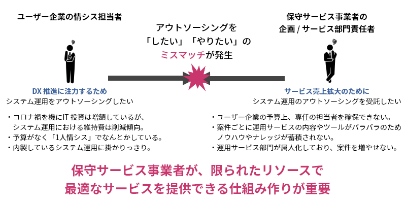 一方で、システム運用のアウトソーシングを受託する保守サービス事業者も、予算が限られる小規模案件は対応が難しく、案件を取りこぼしがちになっています。またシステム管理者の技術力に依存した運用を行っているケースもあり、属人化によって担当者の変更ができないといった技術力のある人材の不足も深刻化しています。小規模な案件を取りこぼさずに受託するためには、限られたリソースで最適なサービスを提供できる仕組み作りが重要です。