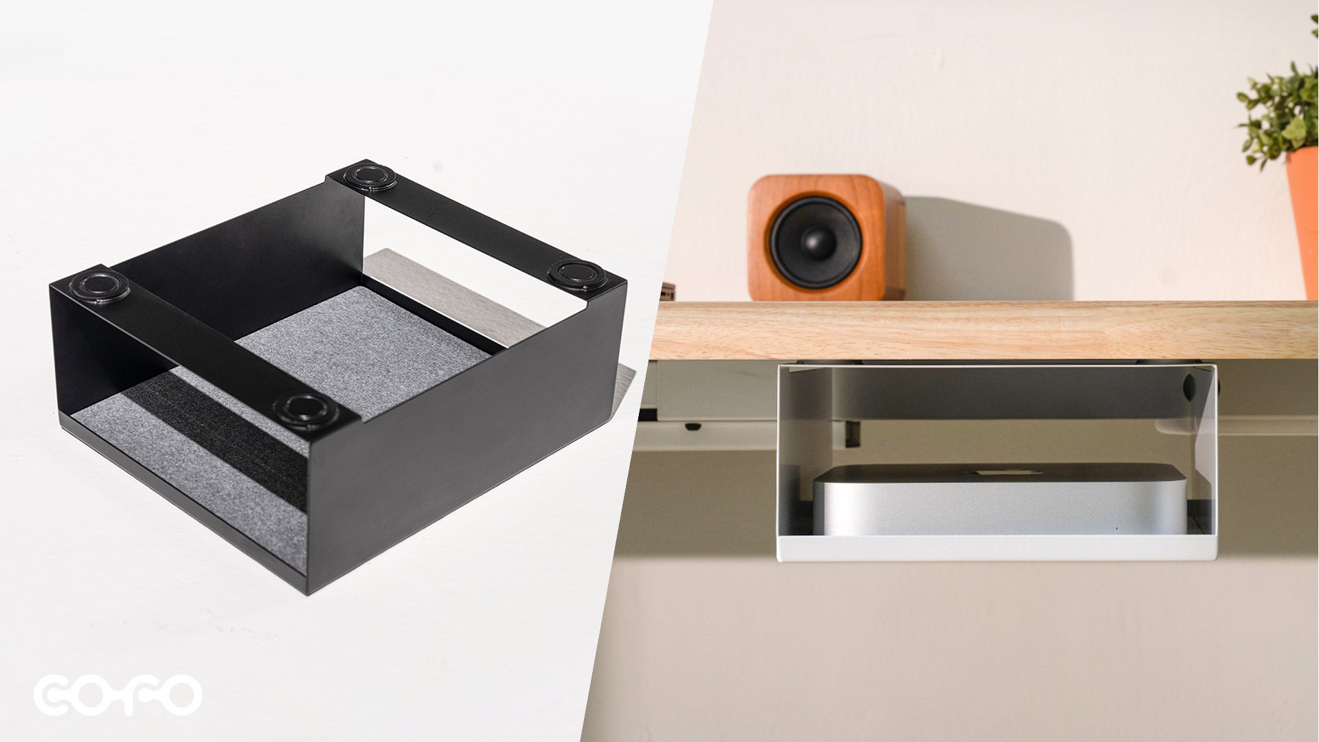 仕事や趣味で使うミニPCなどのガジェット類、日常生活に欠かせないティッシュケースをデスク下にスタイリッシュに収納。余裕のある収納空間を確保しながら、座った際に足を妨げることのない絶妙なサイズ感。デバイス裏面を保護するフェルトパッドが付属し、底面にはティッシュを下向きにスムーズに取り出せる穴を装備。