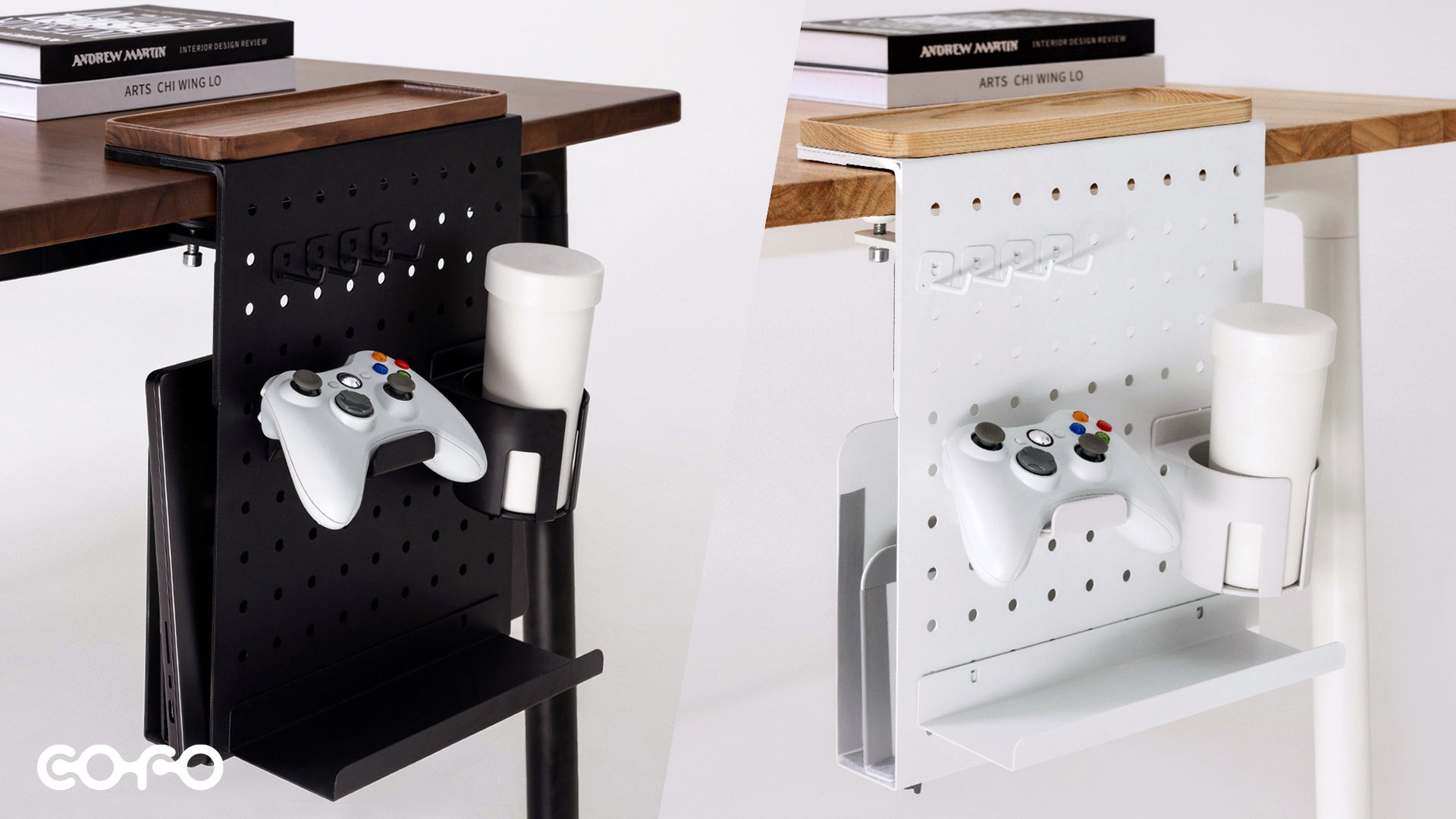 机の端に配置し、下に向かってあらゆるタイプの小物をまとめて収納。パンチングボード型サイドホルダーにフック、ツールスタンド、カップホルダー、ゲームコントローラーホルダーといった付属品を取り付けるだけで、卓上のごちゃごちゃを解消。レイアウトは自由に変更可。上面にはマグネット着脱式の木製トレーも。