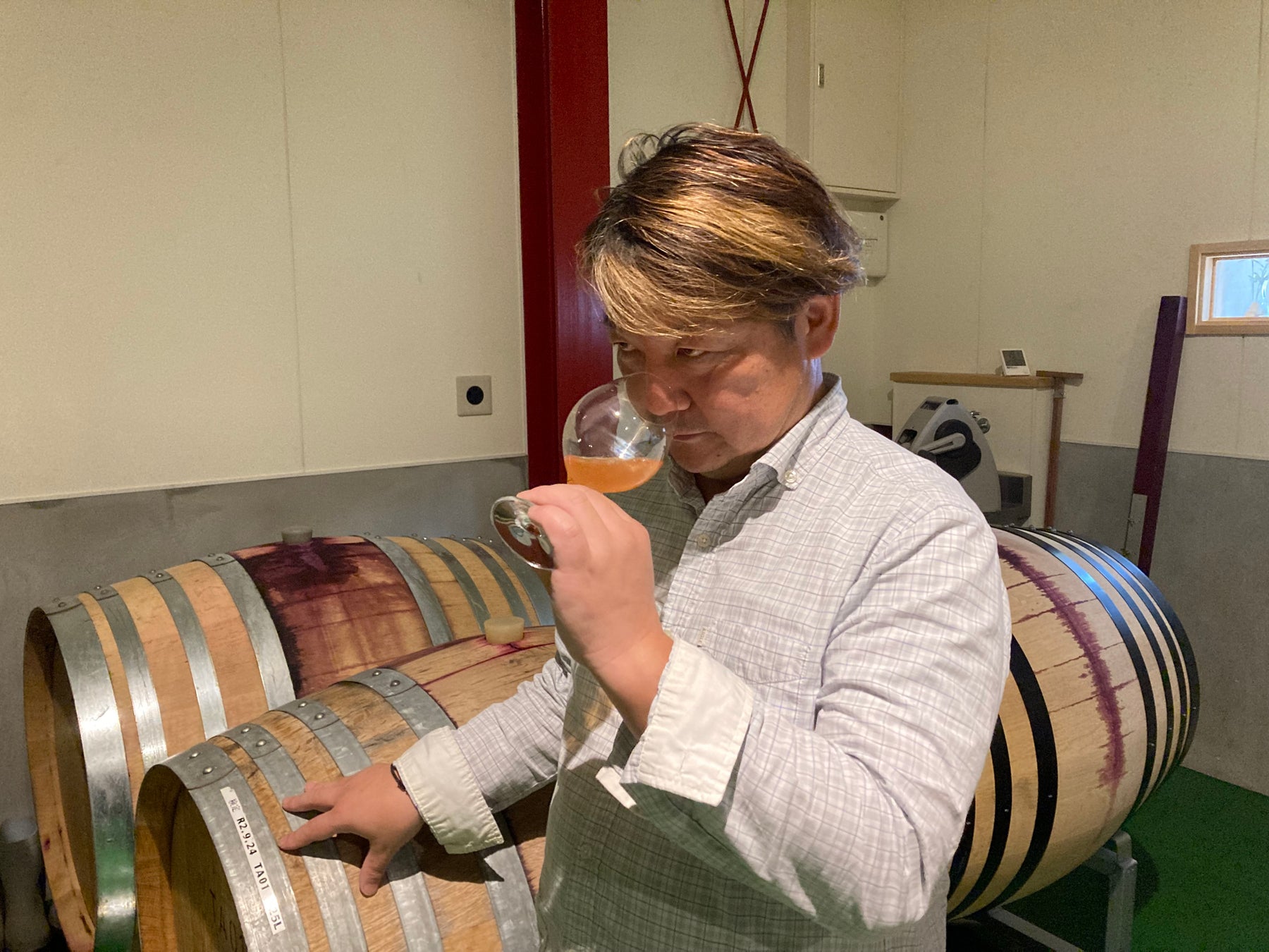 勝沼にある私たちの農園の甲州100%を厳選し、赤ワインと同じように果汁に果皮や種を一緒にタンクに入れ、酸化防止剤無添加、野生酵母で発酵させ、無濾過で仕上げました。