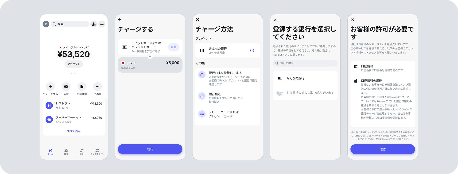 日本国内における「Revolut」アカウントへのチャージ手段の1つとして、みんなの銀行が提供する更新系API(口座振替API)と接続することで、銀行口座直結で手数料なしで即座にチャージができる
