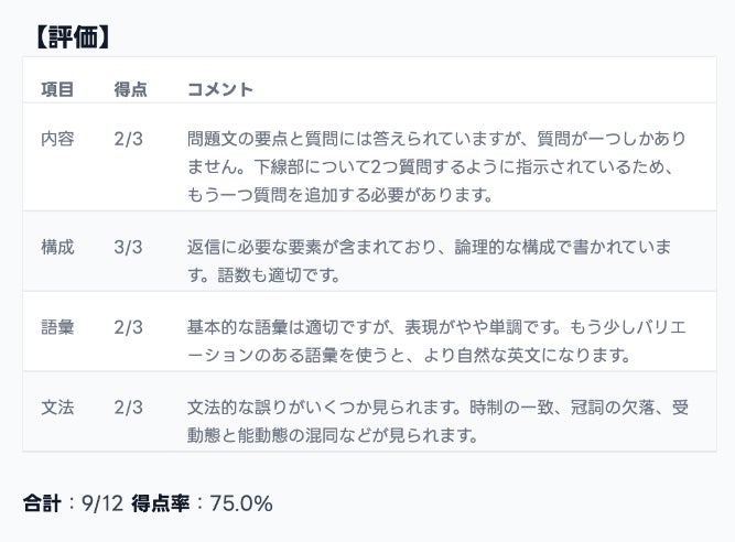 → 今回は合否判定機能を維持しつつ、「英作文をどう直せばいいか」「どんな単語や文法を使えばより適切か」を深く提示し、次回以降のEメール課題や本番での得点アップにつなげられます。