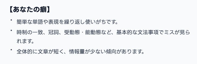 → 本改修ではAIが受験生の解答を解析し、「時制があいまい」「文頭に主語が抜けがち」といった個々の書き癖を【あなたの癖】として明示し、修正を促す設計となっています。