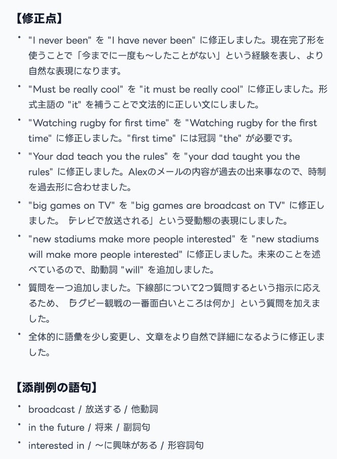 → 今回の改修では、この自動詞・他動詞に着目した指摘を強化。AIが自動的にミスをキャッチし、「ここは他動詞だから、目的語が必要」「この動詞は自動詞なので、直接目的語を置くと誤り」という具体的な修正提案を提示します。