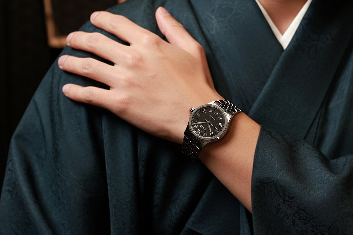 旧漢数字(大字)をインデックスに配したこの腕時計は、日本の歴史や文化を宿す存在。大正から昭和初期の文字美を繊細な彫金で再現し、線や払いの一つひとつまで丁寧に刻まれた旧字体は、クラシカルでありながら新鮮な存在感と、腕に纏う歴史遺産のような特別感を生み出します。