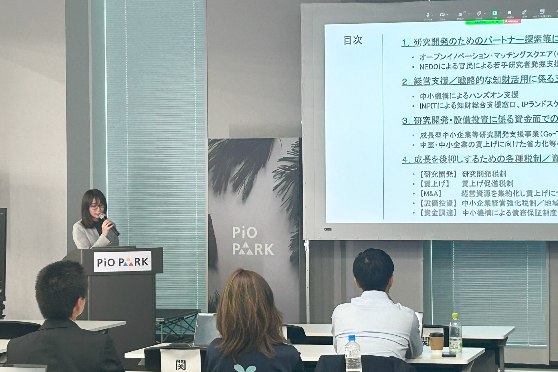 中堅・中小企業の新規事業創出に向けた支援について、①研究開発のためのパートナー探索等に係る支援、②経営支援/戦略的な知財活用に係る支援、③研究開発・設備投資に係る資金面での助成制度、④成長を後押しするための各種税制/資金調達支援の4つのパートで紹介しました。