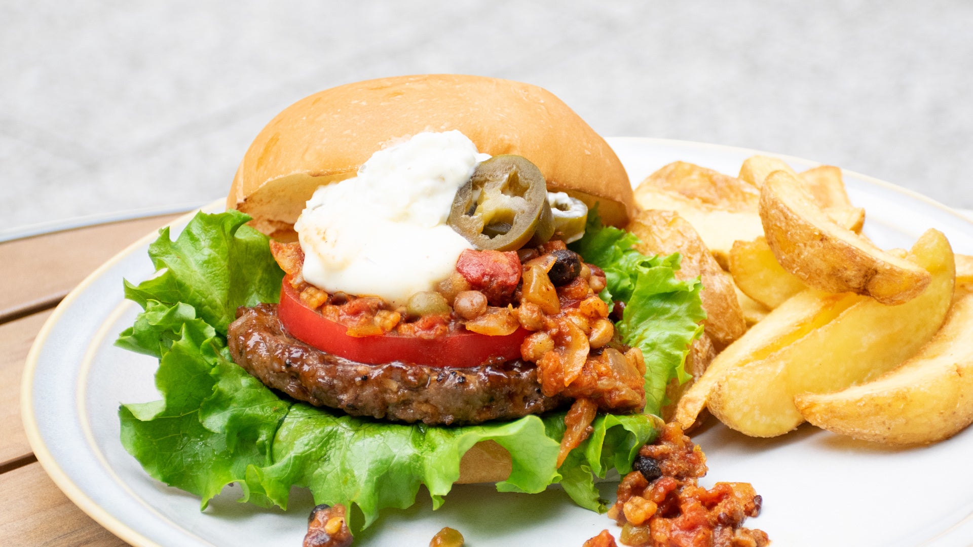 スパイシーなチリコンカンが食欲をそそる夏限定バーガー&季節のスムージー 「五種豆と五穀のスパイシーバーガー」&「白桃スムージー」新発売