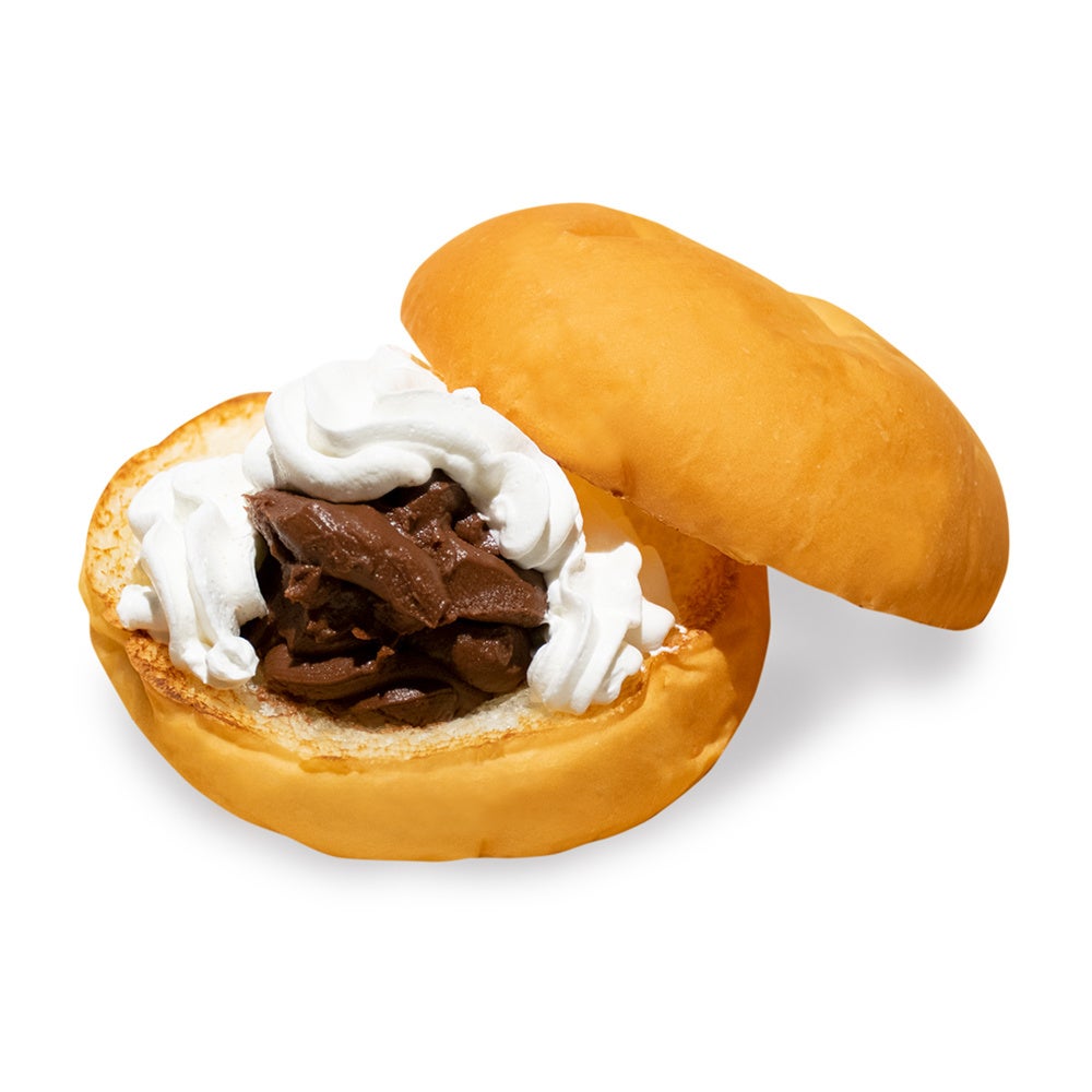 自家製のふわふわバンズにチョコとホイップをサンド。