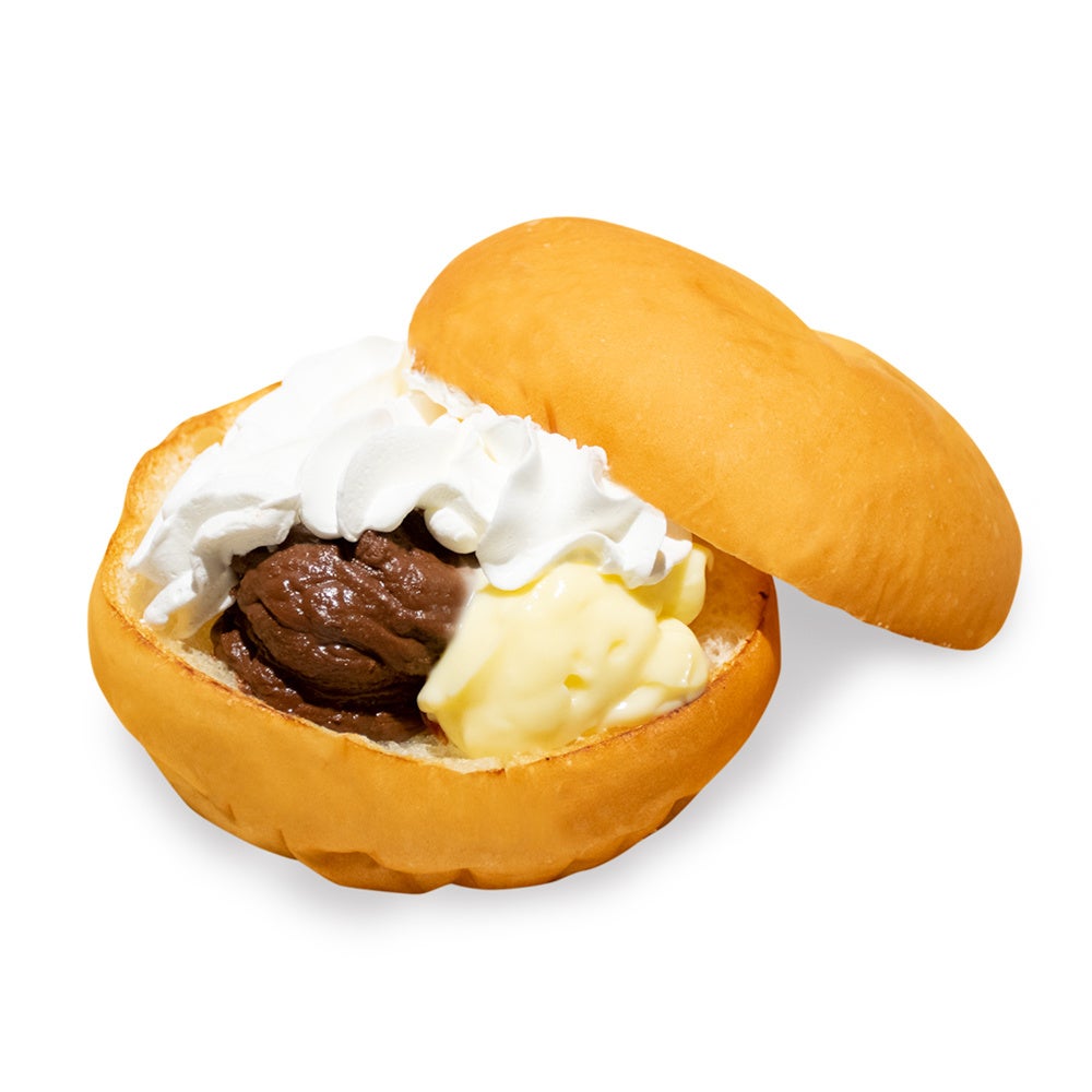 自家製のふわふわバンズにチョコとカスタード、ホイップをサンド。