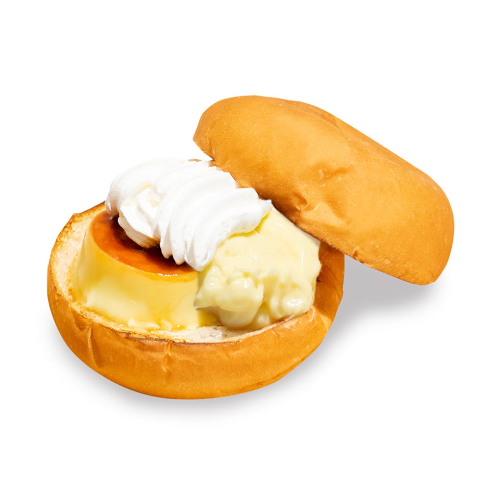自家製のふわふわバンズにプリンとカスタード、ホイップをサンド。