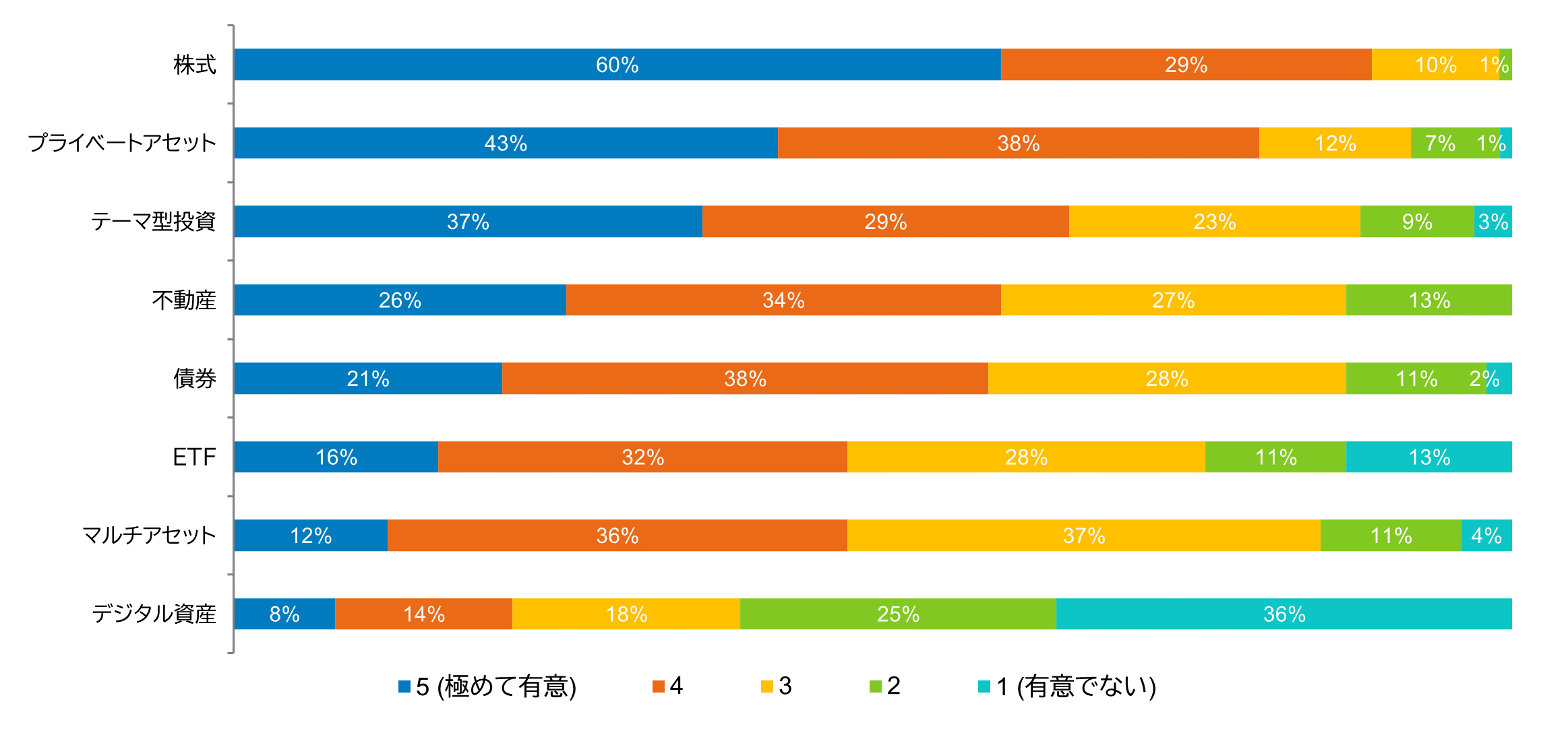 この結果を踏まえると、「公正な移行」を達成する上で、投資の観点から最も魅力的な分野として順に、「再生可能エネルギー」(92%)、「テクノロジー / IT / 通信」(61%)、「農業 / 食品」(60%)が選ばれたのもうなずけます。資産クラス別では、89%の投資家が「公正な移行」を実現する上で最も重要な役割を果たすのは「株式」と考えており、次いで 「プライベートアセット」(81%)、「テーマ型投資」(66%)となりました。
