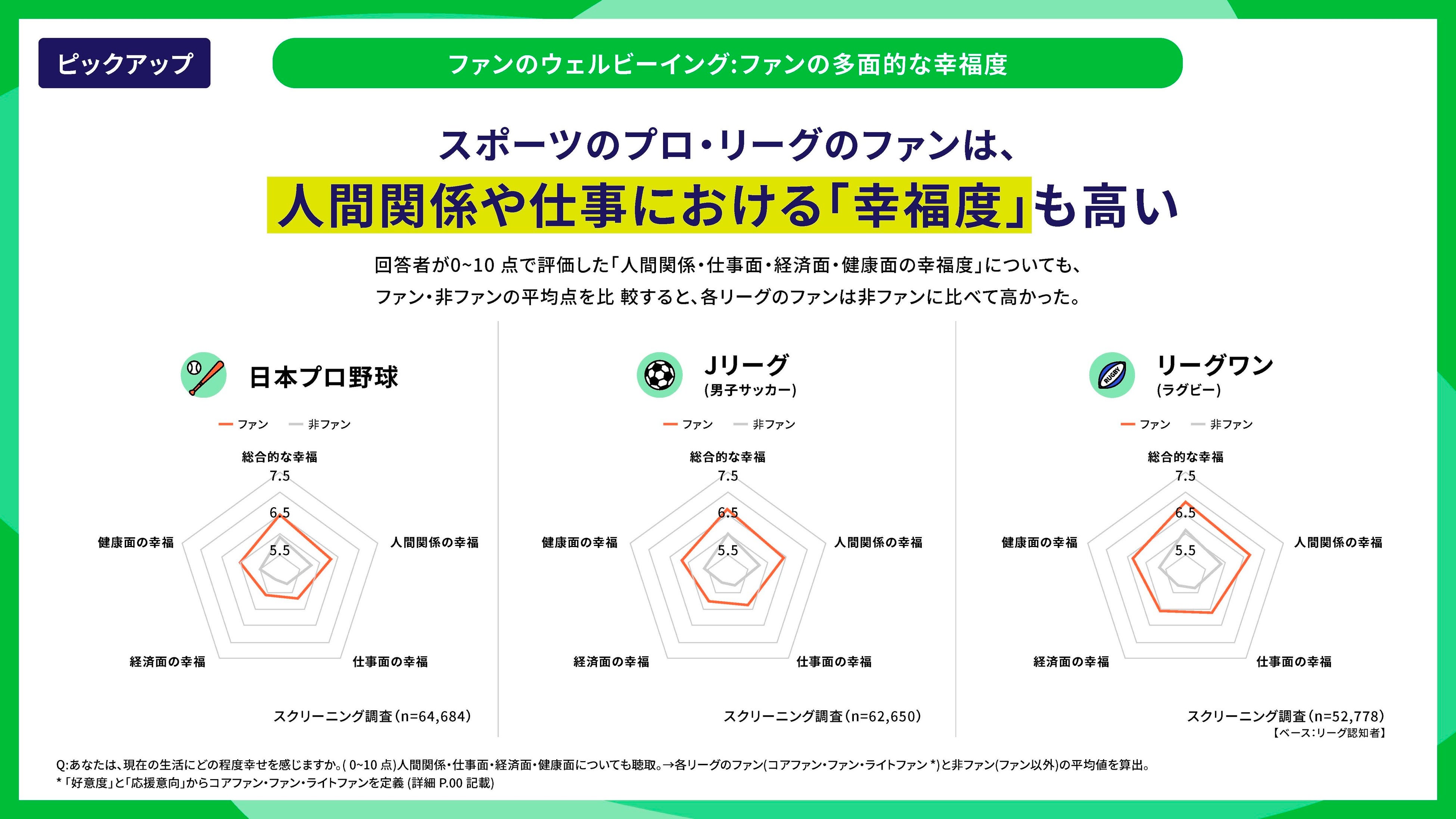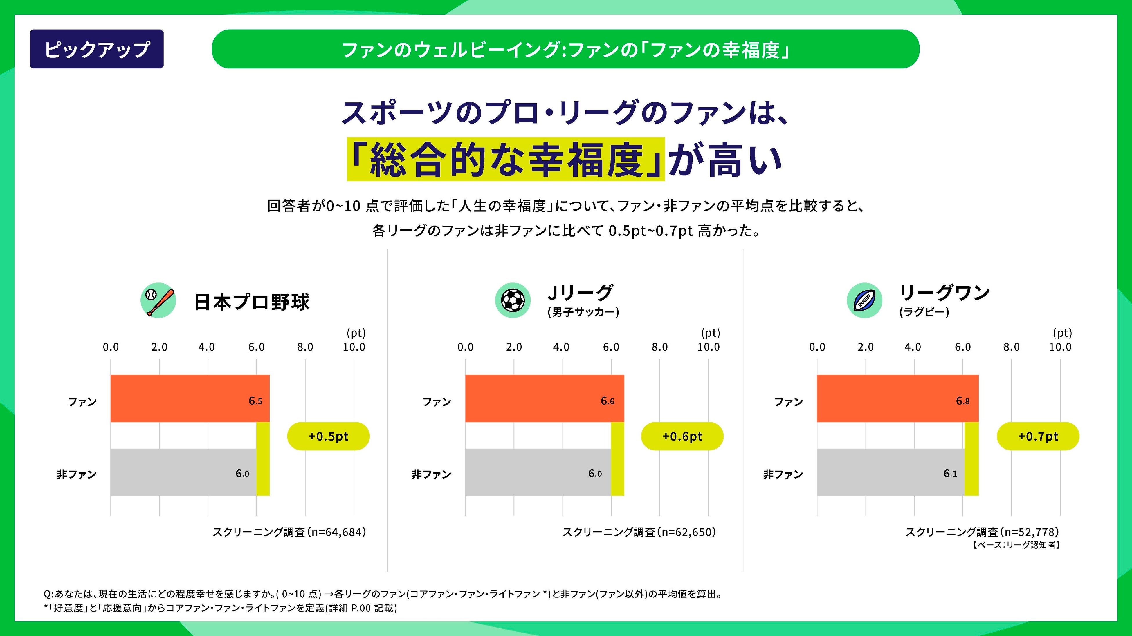 スポーツのプロ・リーグのファンは、ファンでない人に比べて「総合的な幸福度」が高い。